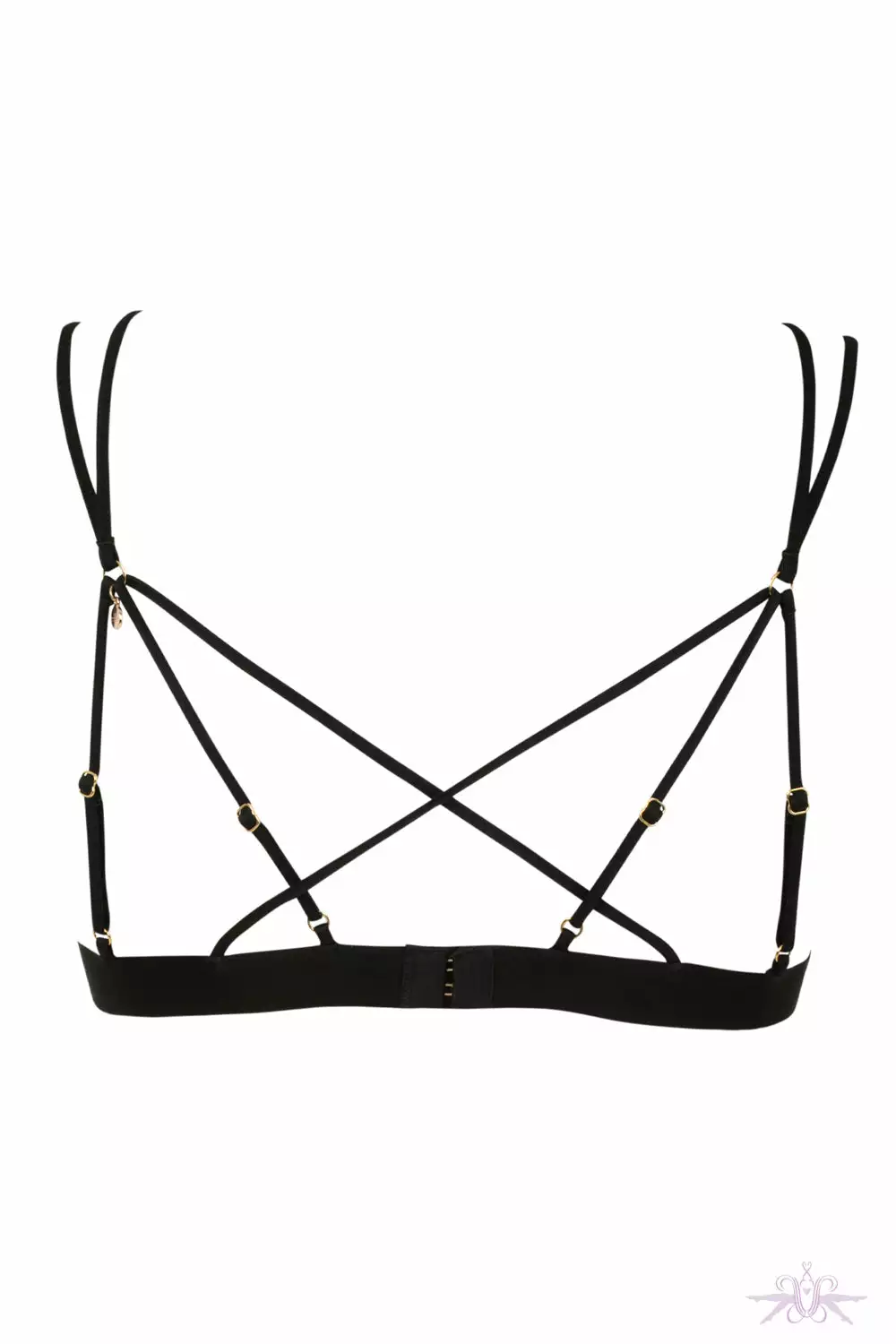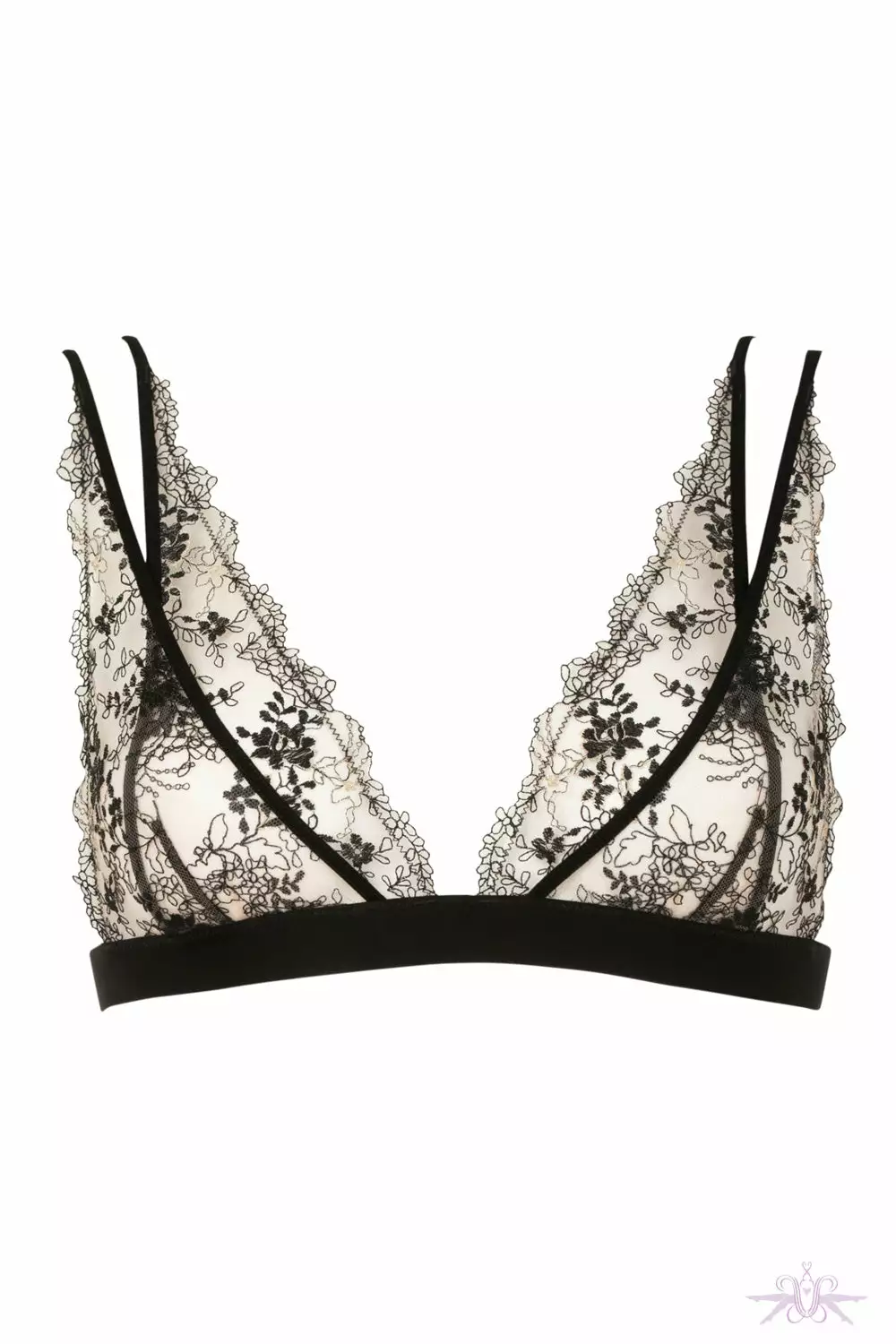 A sensual triangle bra from the gorgeous Apres Minuit collection at Atelier Amour. A beautiful sheer tulle base with black embroidery that enhances the figure with the under bust band. The back of the bra has elastic and a criss-cross design.