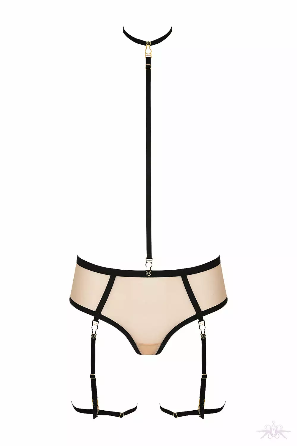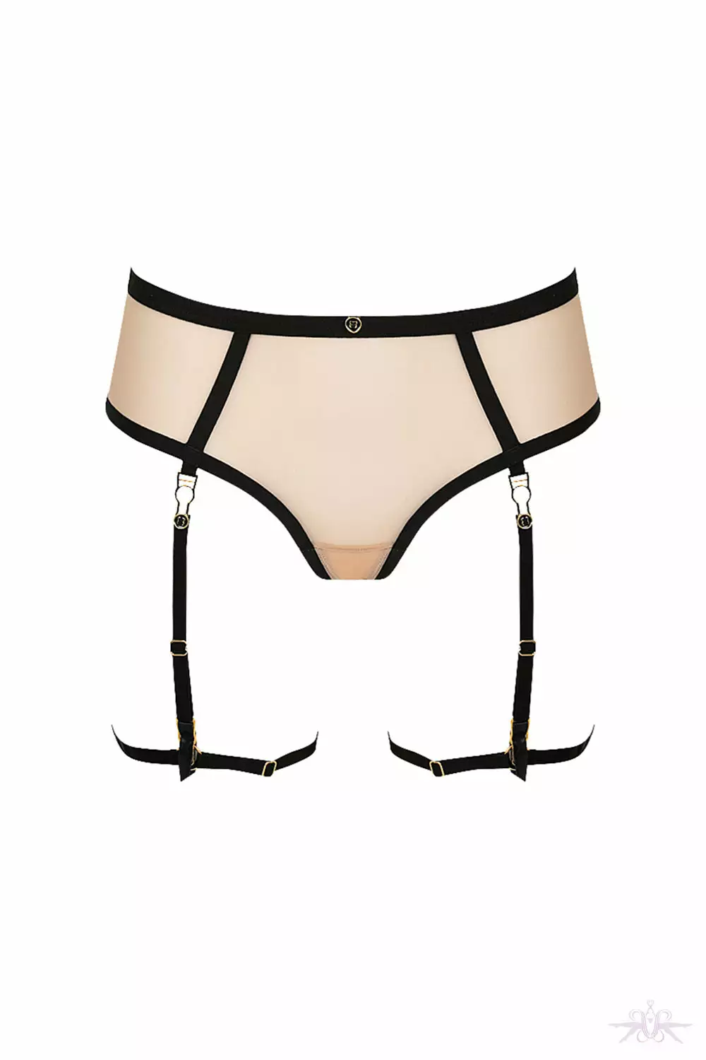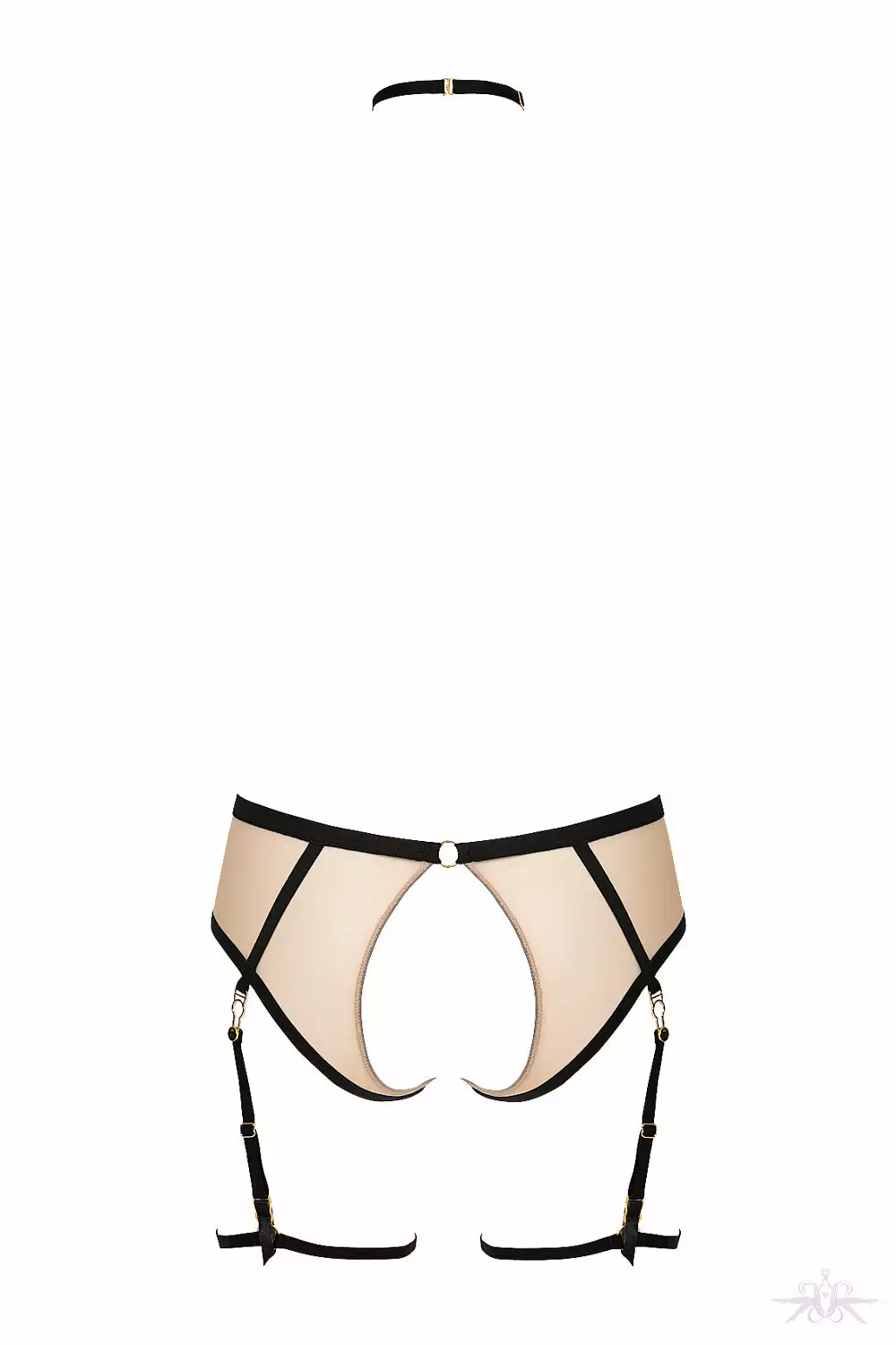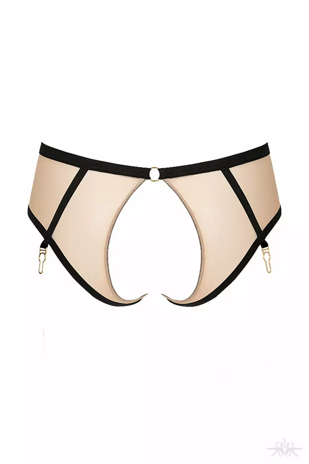 A very seductive luxurious piece of lingerie from French designers at Atelier Amour. This open brief is has so many uses: harness, open pants, garter briefs with integrated garters, there are so many exciting possibilities to discover. The soft nude coloured tulle is so sensual and soft. The golden clips and buttons for opening and adjusting are beautiful. It is perfect with the matching bra.