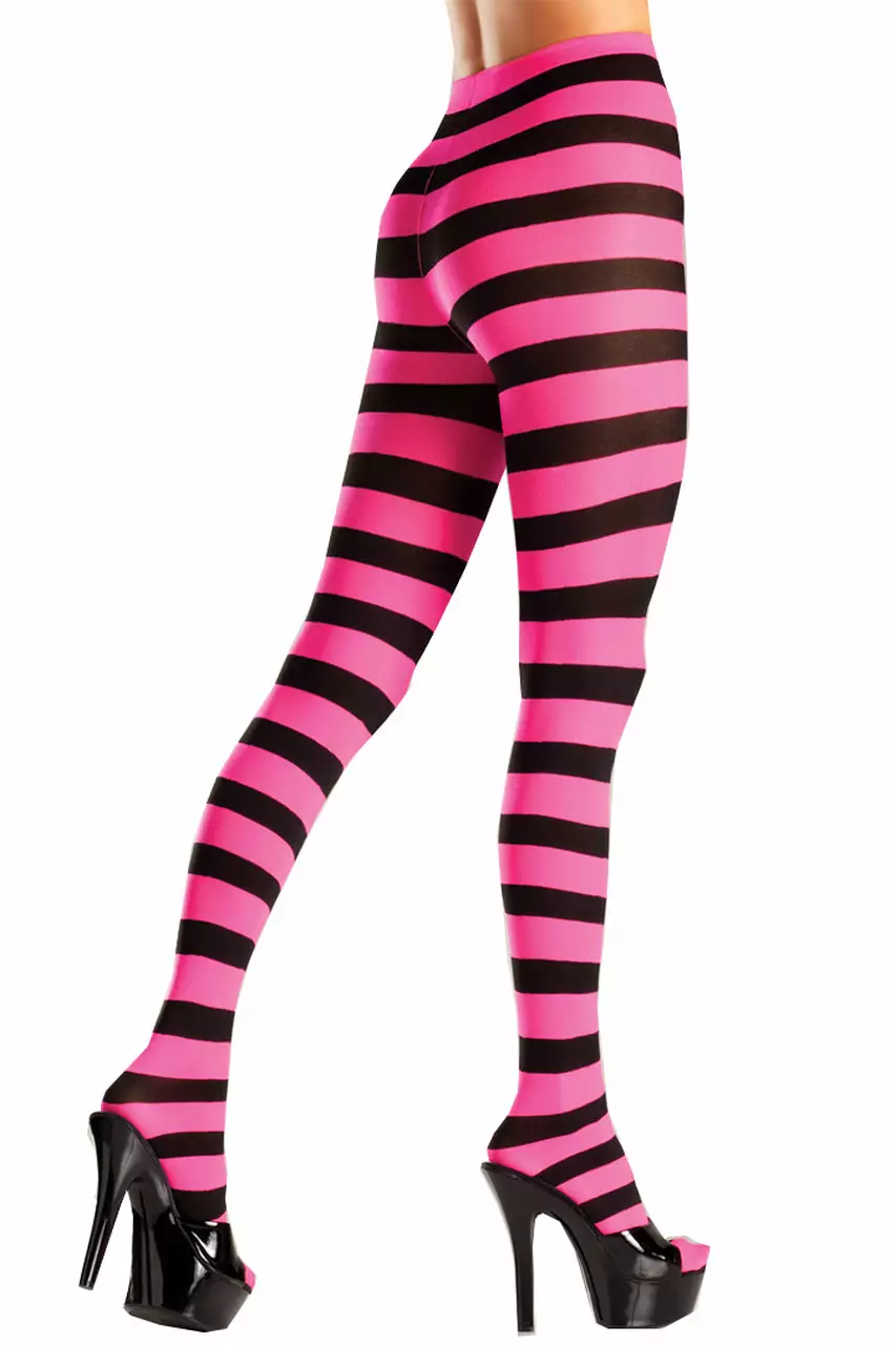Put a horizontal twist to your verticals with this fun pair of Black & Pink Wide Striped Pantyhose. The combination of neon pink and black is a surefire way to keep their heads turning. The wide horizontal stripes will make you noticeable even from a mile away! It has an opaque color and covered feet so you are kept warm, cozy and protected from the waist down to your toes. Stand out from the crowd while also keeping yourself comfy with its stretch elastic waistband. You’ll never be topsy turvy when you pick this pair to embellish your costumes, your holiday outfits or even your festival outfit.