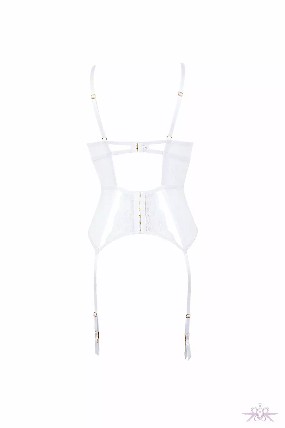 A gorgeous wired basque from the Marseille collection at Bluebella. Beautiful floral embroidery adorns the sheer mesh on this basque which sits exquisitely on the body. It has slight cut out detail to the front with a slim belt design. The adjustable shoulder and suspender straps and five hook and eye fastenings to the rear allow for a perfect fit. Matching brief and thong are also available.