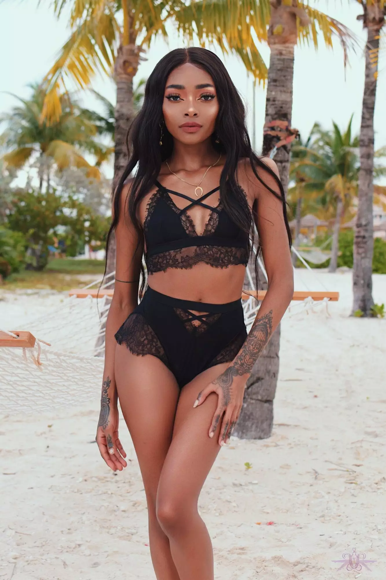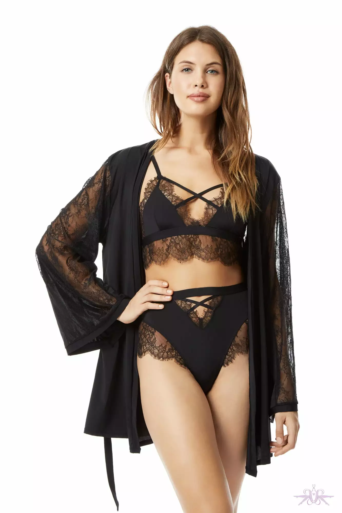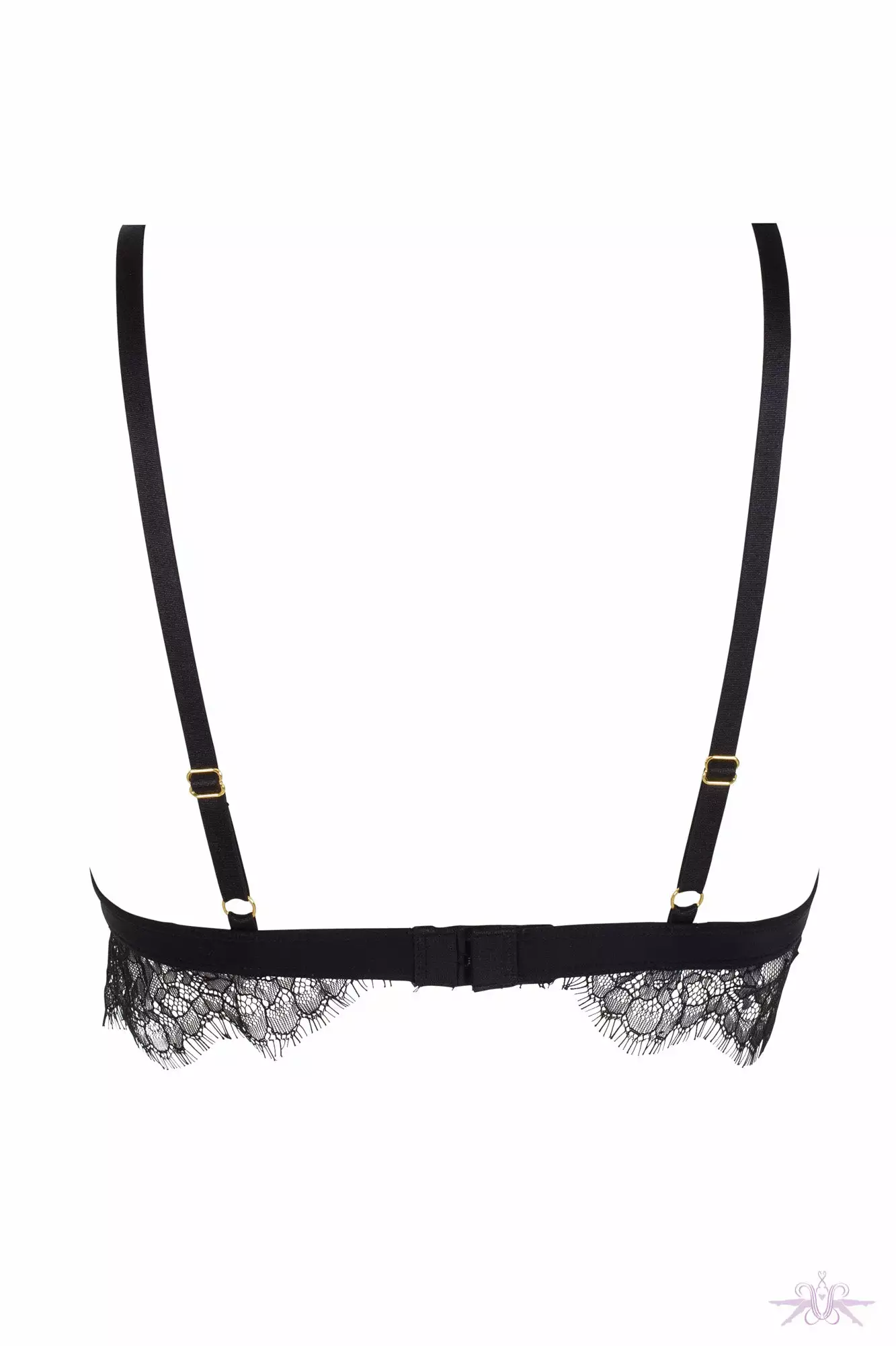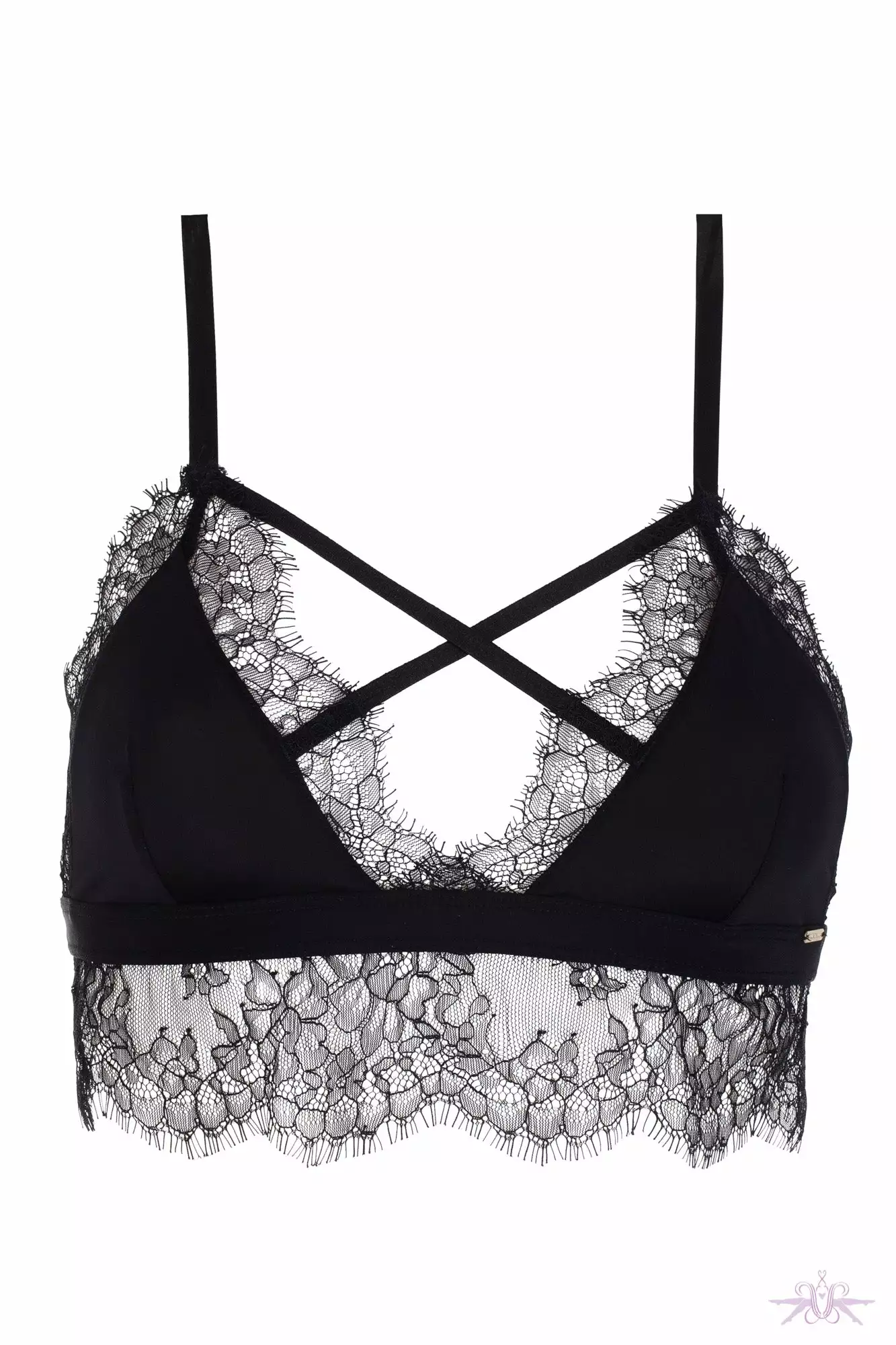 This soft bra from Bluebella is edged with wide bands of delicate lace. Featuring triangular cups laced on both sides, including a laced elasticated underband with a gently scalloped shape and eyelash fringing. This intricate design is accentuated with slim crossover straps in the front, which bring a subtle modern edge to this piece.Matching items available Nyane High Waist Brief and Nyane Kimono