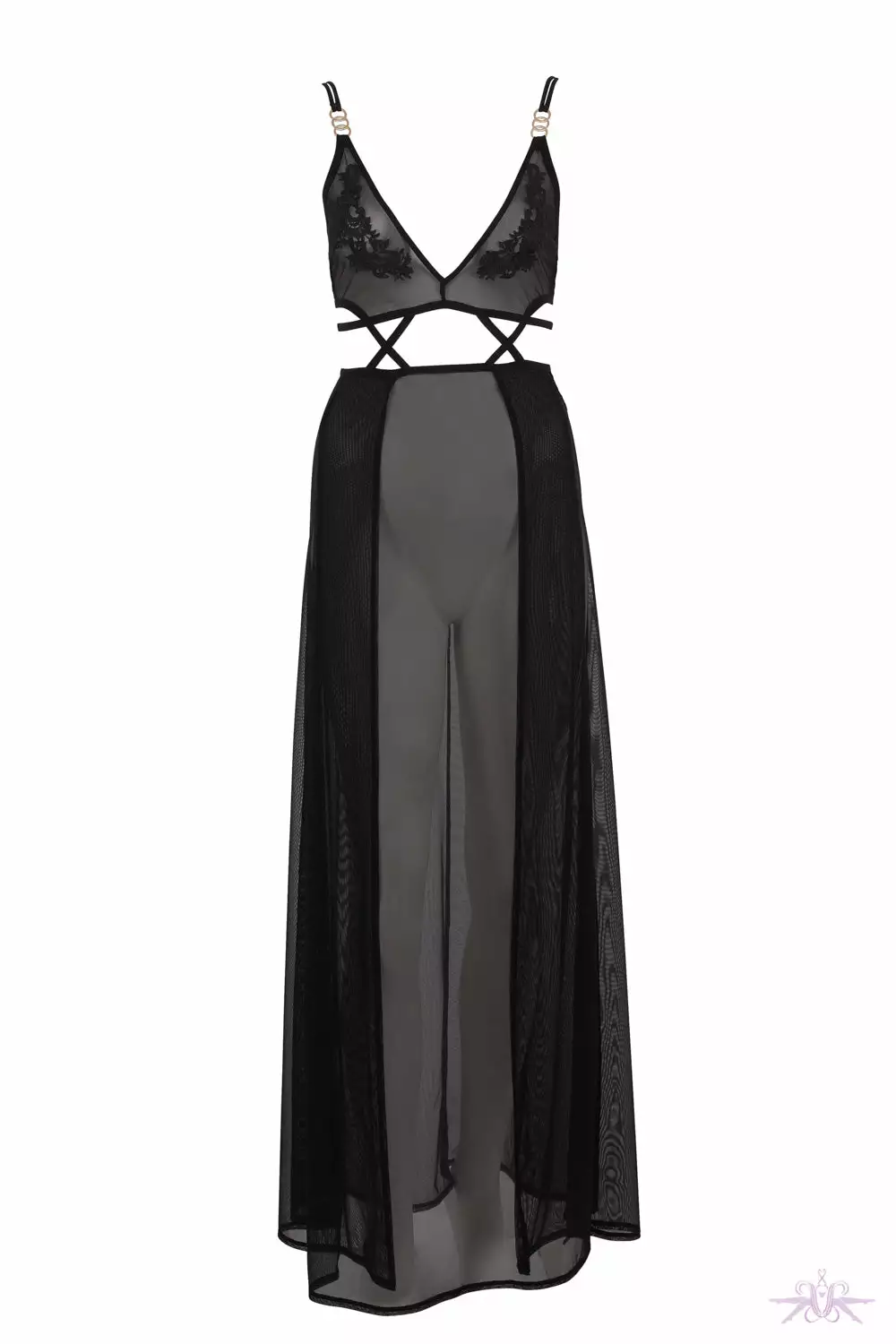 An alluring long chemise from Bluebella. This design is made of superfine mesh which is cutt in a beautiful fluid shape. The skirt of the chemise falls loosely in two panels, the back coming around the sides to overlap with the front of the piece creating movement and flow. The midsection of the front works with slim, elasticated strapping to create a cage-effect, whilst guipure lace appliqué embellishes the cups. Tri-circular gold tone hardware connects to the shoulder straps, which are adjustable for the perfect fit. A swan-neck clasp secures the top section of this chemise, perfect for relaxation and sleep.