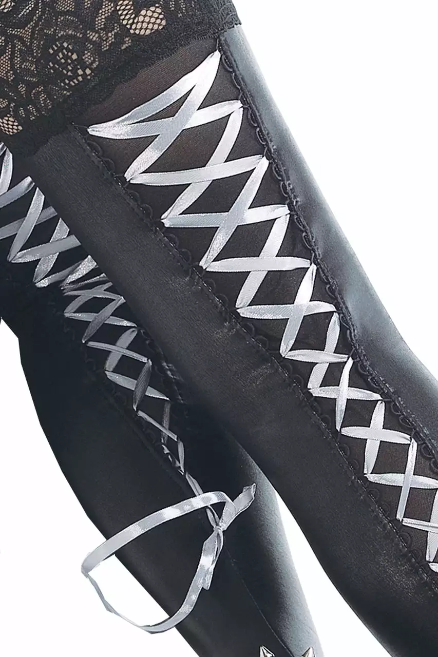 Dominatrix with a touch of sugar, these Lace Up Ribbon Wet Look Thigh High Stockings features a pair of ‘wet look’ thigh high stockings with a matte finish, white lace up ribbon backs, closed toes, and stretch lace tops. Wear these faux leather thigh highs as a sexy costume accessory for your cosplay costume, or for BDSM play with your dominatrix outfit. These thigh highs feature lightweight stretch material that forms seamlessly to curves allowing for all-day comfort.