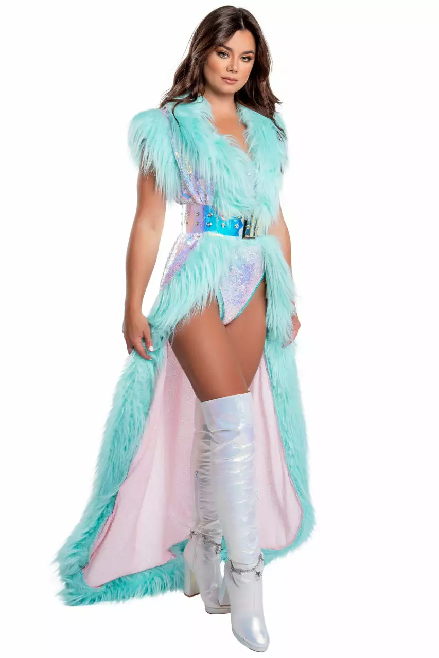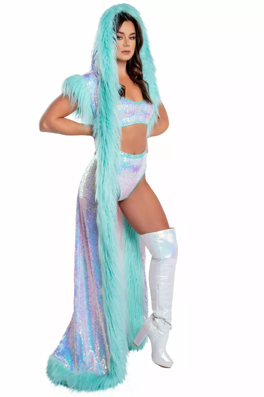 Catch their eye in this holographic sequin mesh duster with faux fur trim and attached hood. (Includes duster only.)