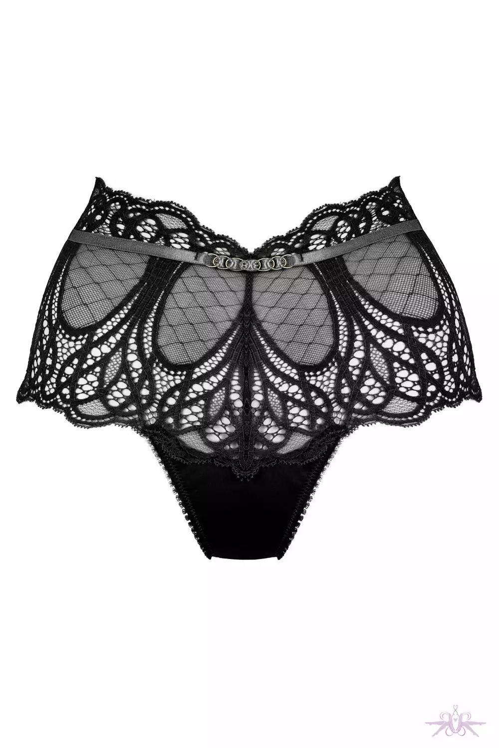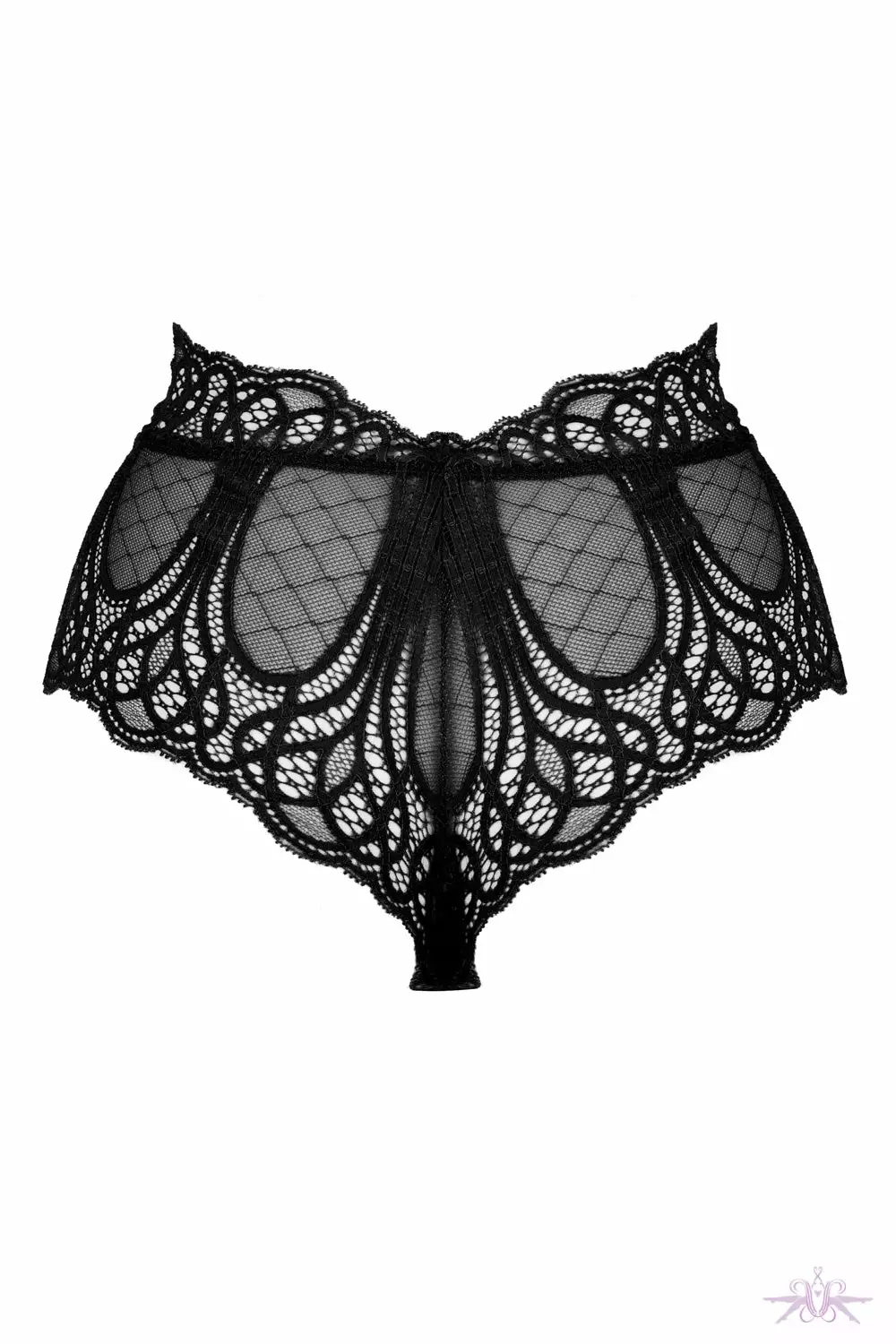 A seductive brazilian knicker from the Angels collection at Jolidon. This sheer high waist lace brazilian is so decadent with its sheer floral lace tulle panelling. The fluted lace edge to the front and rear enhances the derriere beautifully. The elasticity to the waist is comforting and sophisticated. Matching items are also available.