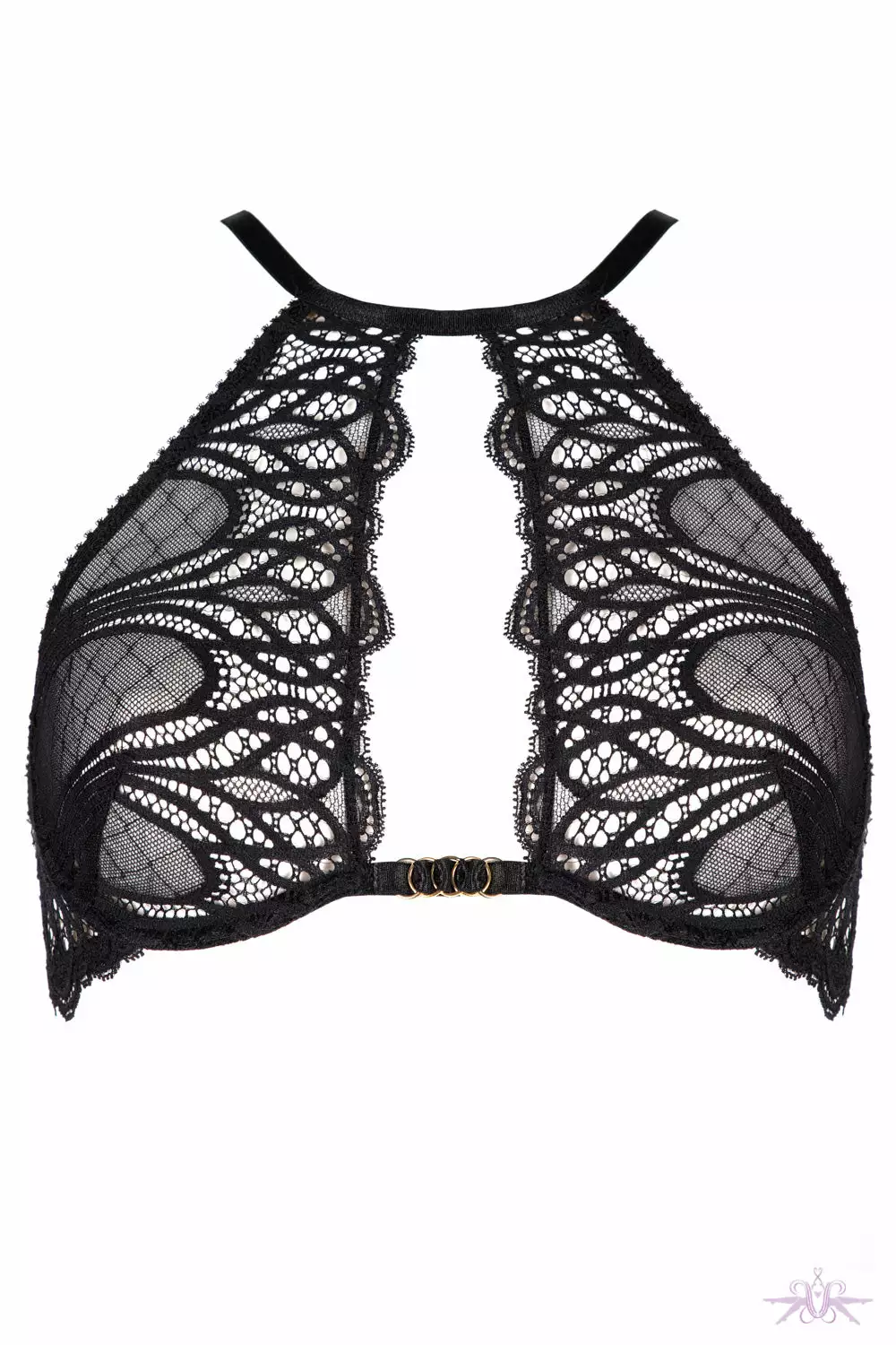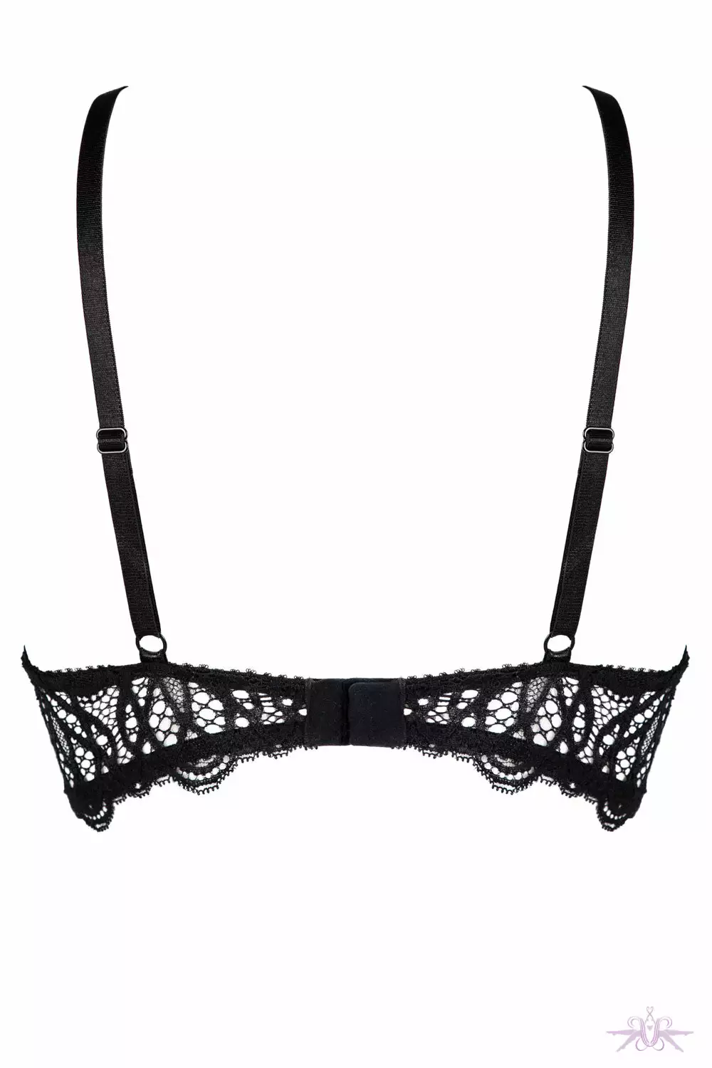 A seductive underwired sheer mesh black bra from the Angels collection at Jolidon. This black lace bra is so glamorous with its sheer floral mesh detailing and cut out opening between the bust. It is underwired which enhances the bust beautifully and the elastic strapping to the neck and shoulders is comfortable creating an alluring piece of lingerie. Matching items are also available.