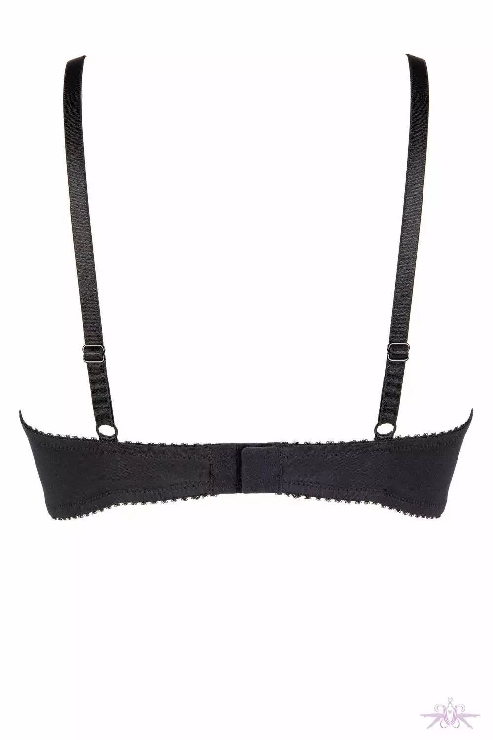 A beautiful padded push bra from the Angles collection at Jolidon. This black lace bra with nude underlay is soft yet gives support. Soft black microfibre sits around the bust enhancing the shape. Matching items are also available.