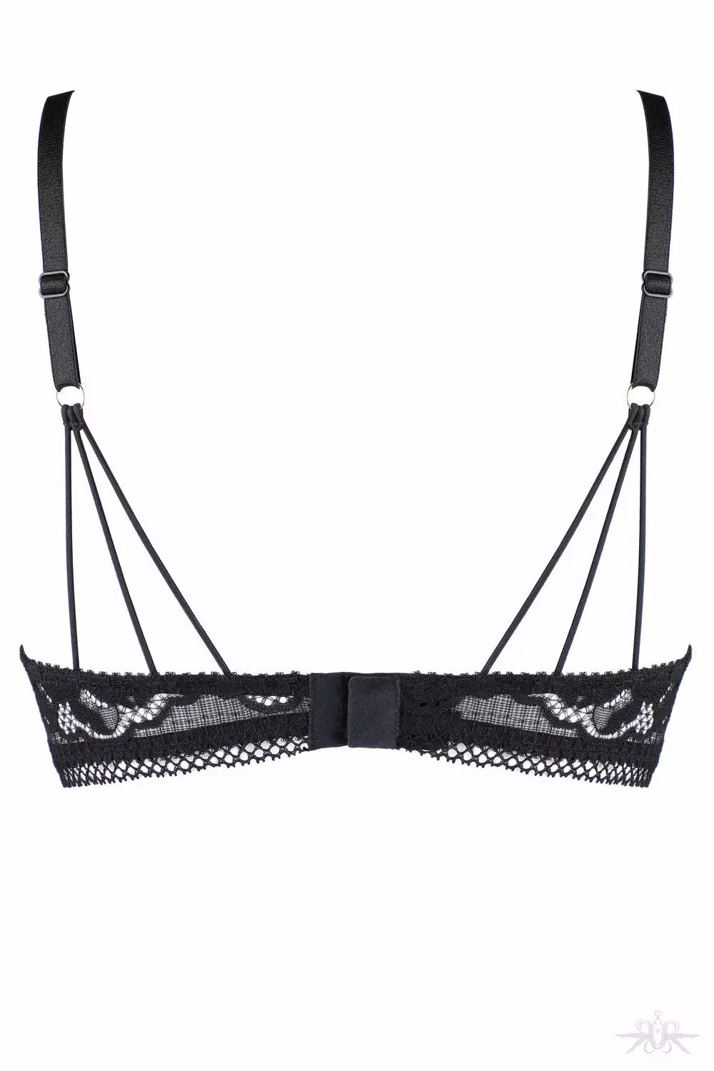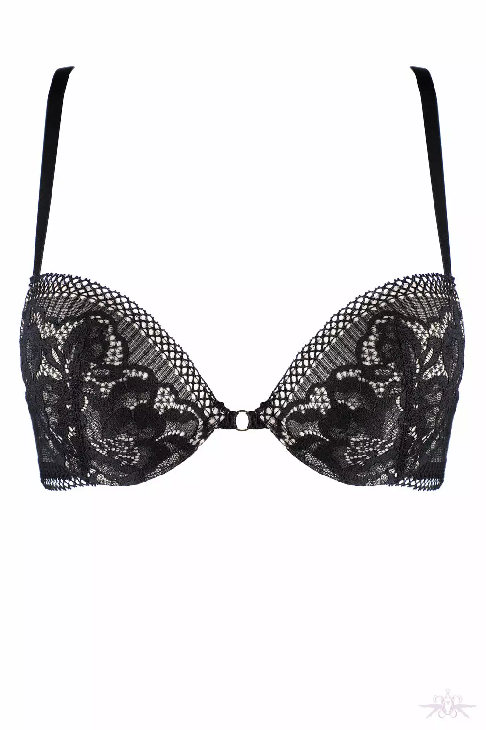 A beautiful padded push up bra from the Rock DJ collection at Jolidon. This black lace bra with sheer floral mesh has delicate scalloped edging and nude underlay. It is underwired for support and shape and multiple black straps feature to the rear of the bra which are adjustable. Matching items are also available.
