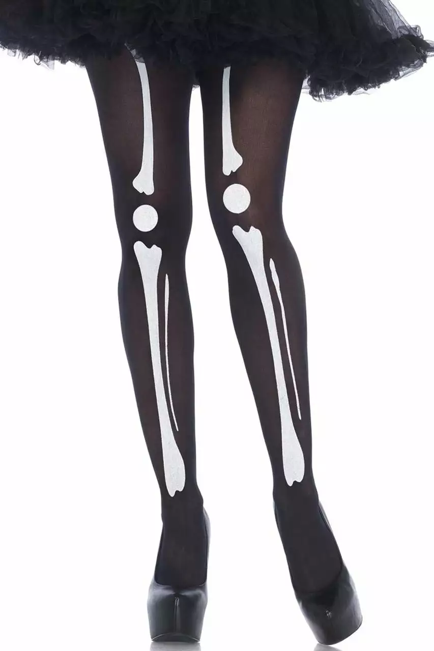 Put some meat on those bones with these Black Skeleton Print Pantyhose featuring costume tights for women. These skeleton print tights feature black opaque nylon pantyhose with white skeleton print bones, and feet.