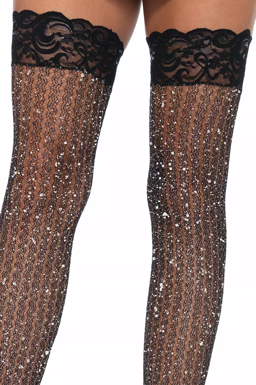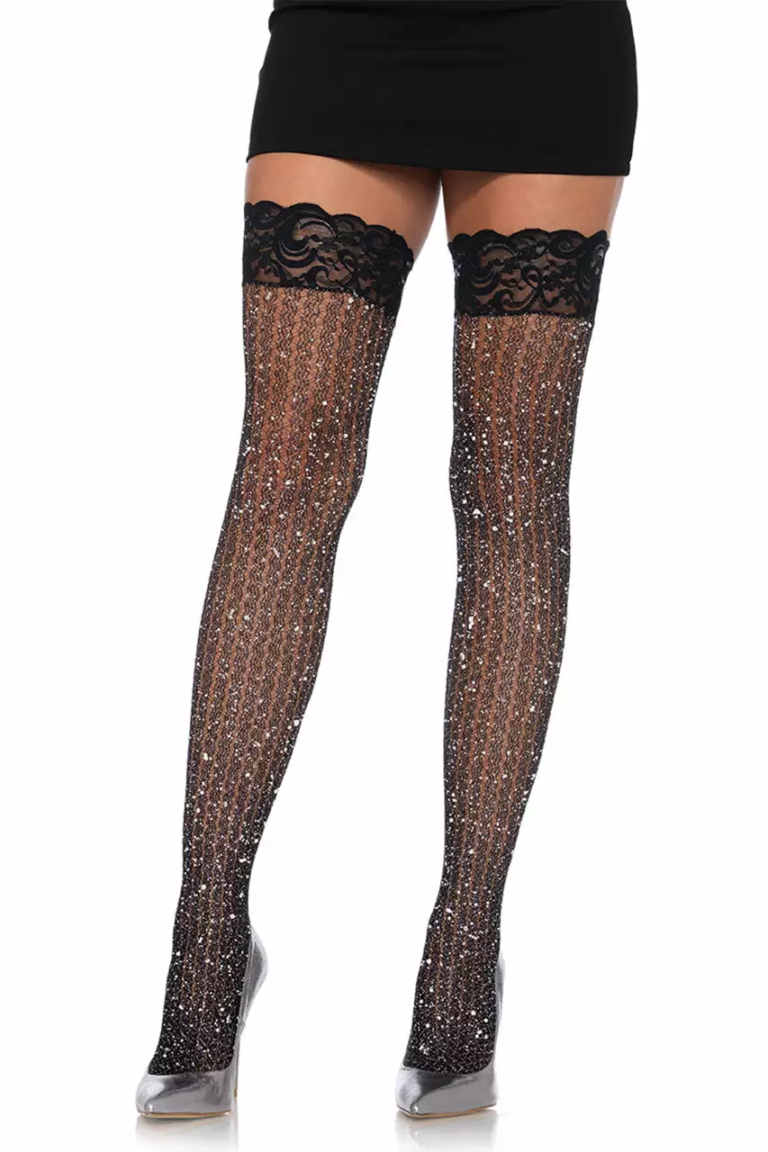 These cable knit patterned thigh high stockings feature a shiny lurex and lace top.