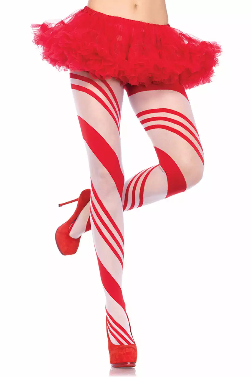 Complete your holiday look with these red and white, candy cane striped pantyhose.