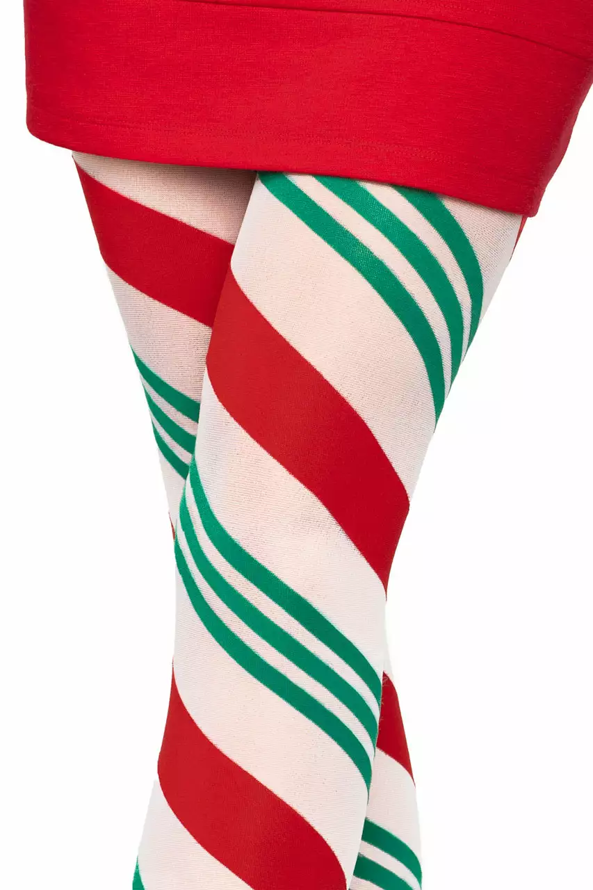 These red and green ribbon print tights are the perfect addition to any holiday look.
