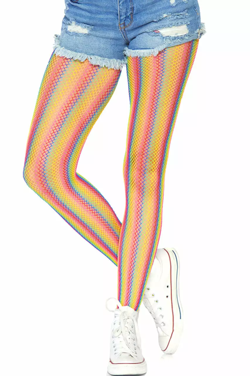 Taste the rainbow in these Rainbow Striped Fishnet Pantyhose Tights that feature stretch fishnet tights with colorful rainbow stripes, pantyhose with feet, and stretch waistband.