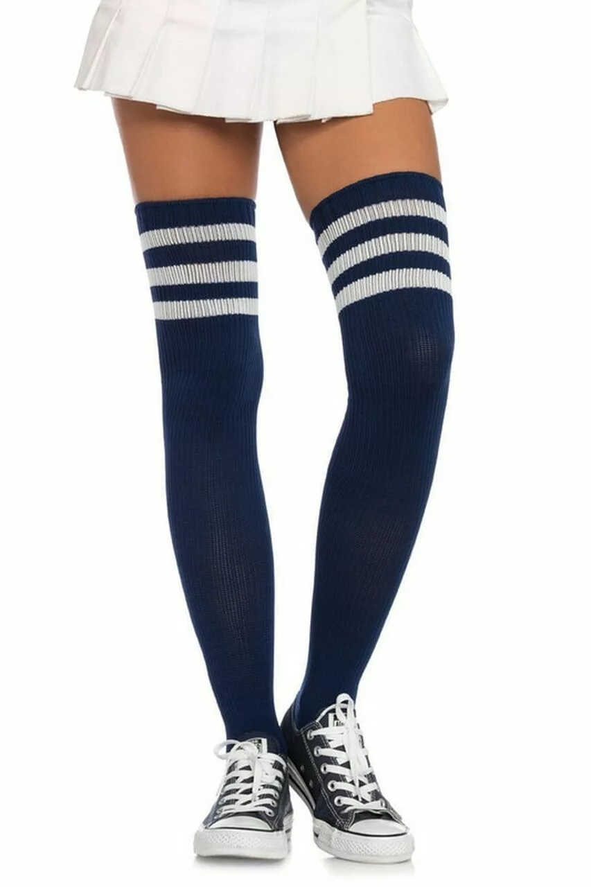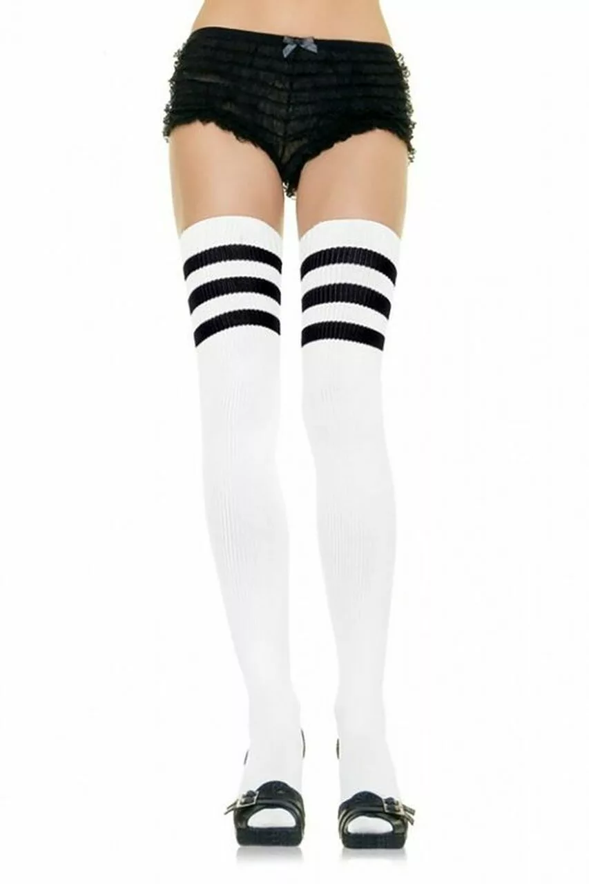 You will look ready to go in these sporty athletic ribbed thigh high stockings with three speed stripes on top.