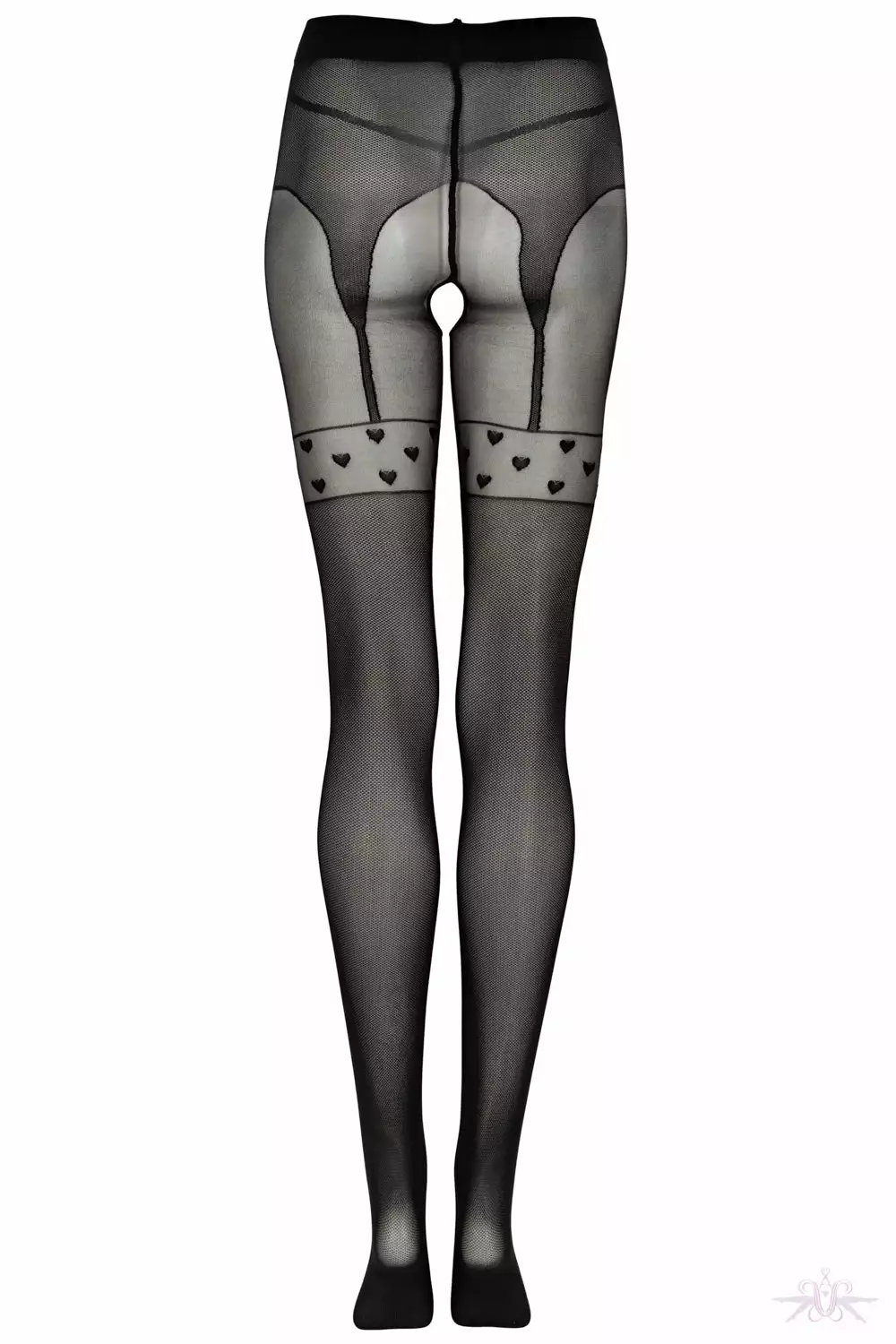 An unique pair of black open tights that are striking in their design. These faux suspender tights are stunning with their alluring leg leading to a heart adorned faux band like stockings that continues with the faux suspender straps to the waist. The sensual open crotch adds excitement.