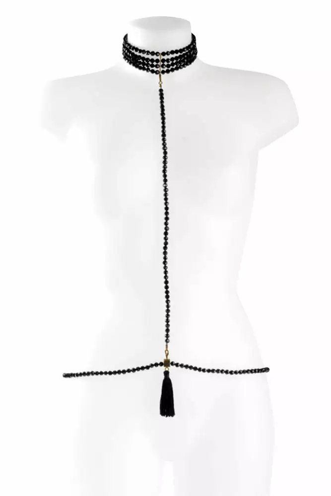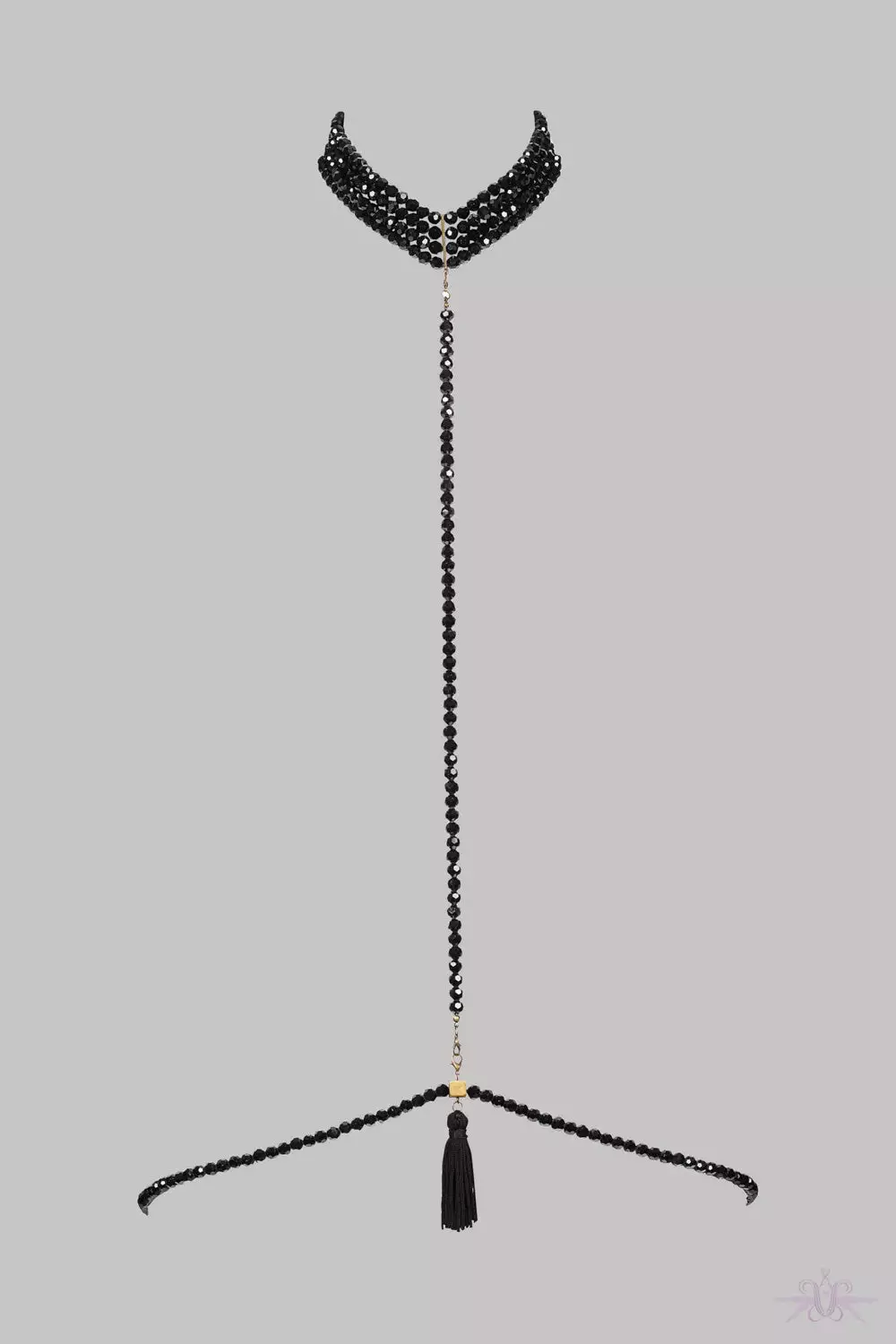 The beautiful seductive harness is made from jet pearls, and the necklace is detachable, enabling it to be worn alone.