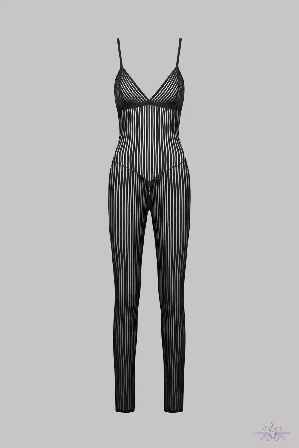 A seductively gorgeous catsuit from the Bande à Part collection from french designers Maison Close. This catsuit has a lovely v-neck, triangular cups and an open crotch with zip. The soft light fabrics and graphic lines elongate the body. A great choice for lounging in, a cosy night in or under clothing.