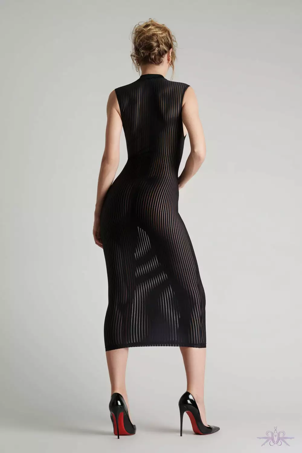This gorgeous sleeveless dress a new edition to the Bande à Part collection at Maison Close. This piece is designed with graphic lines which slim and lengthen the body and is semi-sheer in appearance with soft tulle and microfibre fabric. The high neck on this sleeveless dress and the semi sheer fabric make this a captivating piece, with a figure flattering cut that encapsulates the feminine form to the greatest effect. Matching items also available.