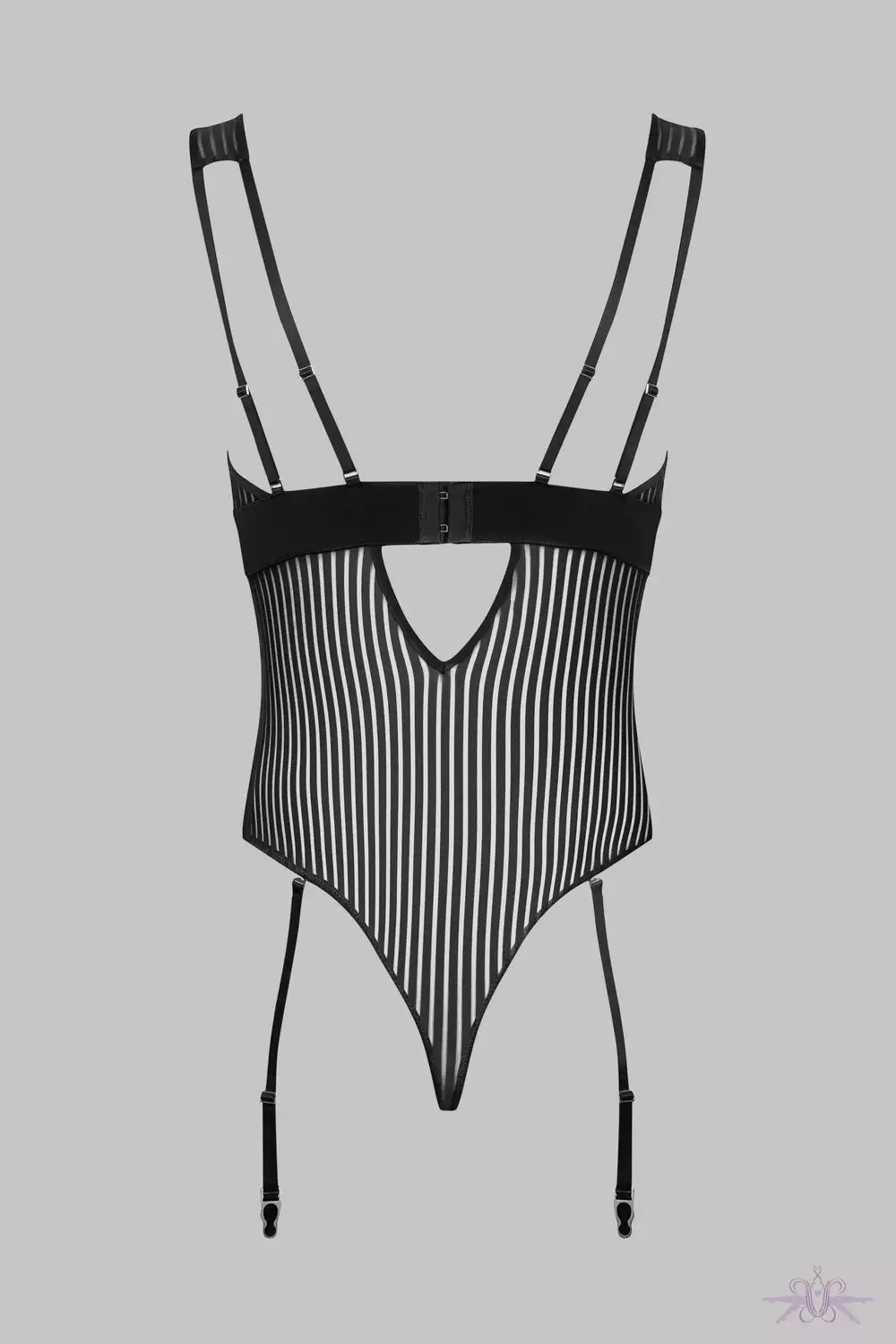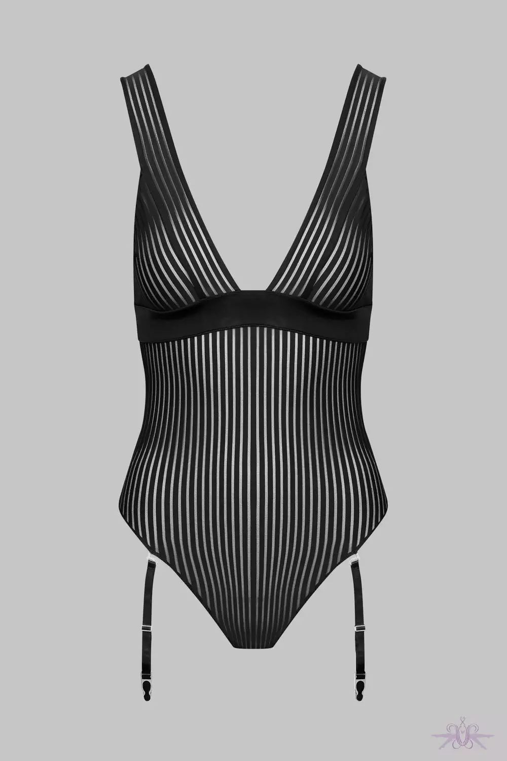 A daring and luxurious thong body from the gorgeous Bande à part collection at Maison Close. Featuring graphic lines, subtly playful sheer and second-skin effects, make the Bande à Part collection lingerie have a rebellious edge. The adjustable shoulder and suspender straps create the perfect fit. Matching thong is also available.