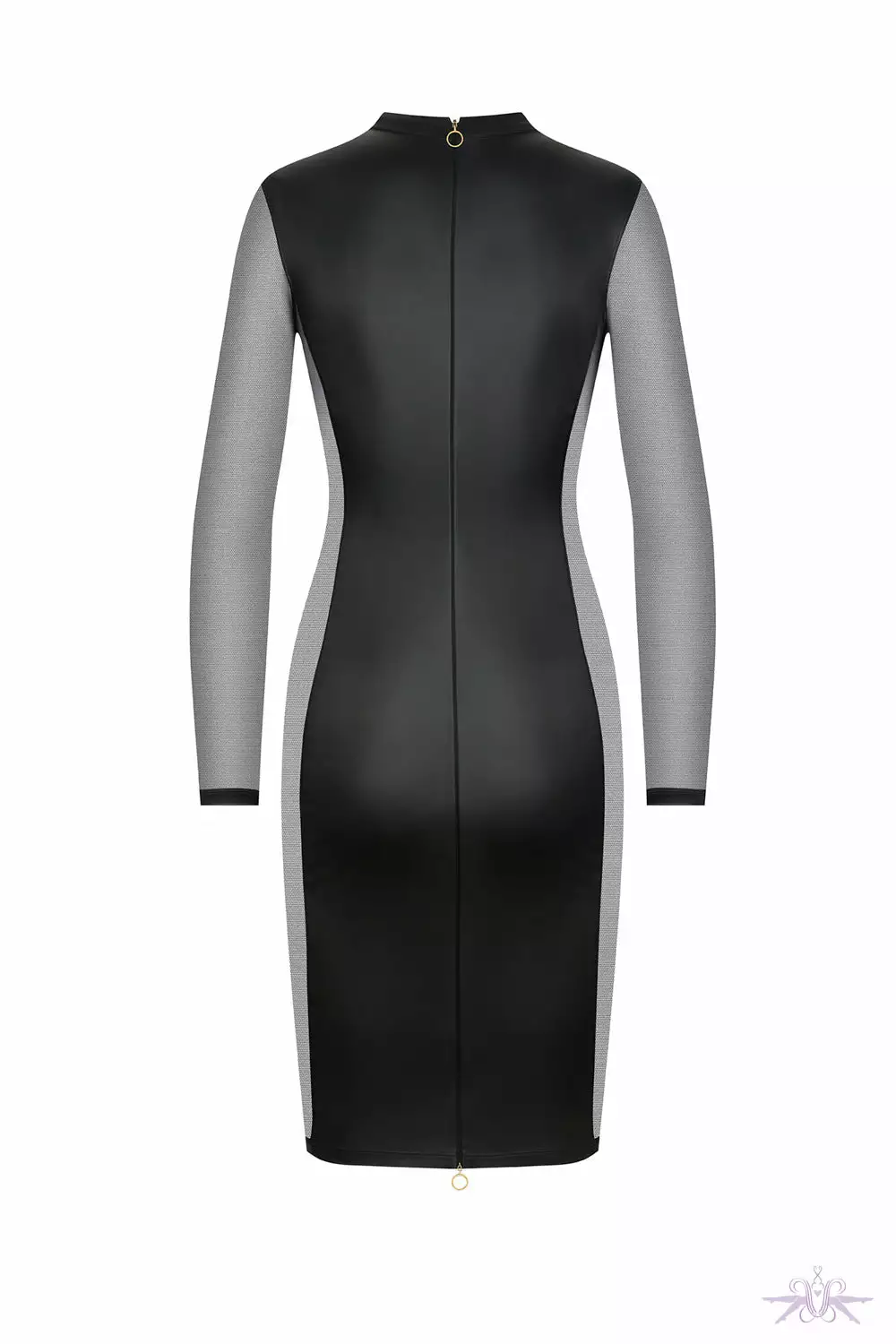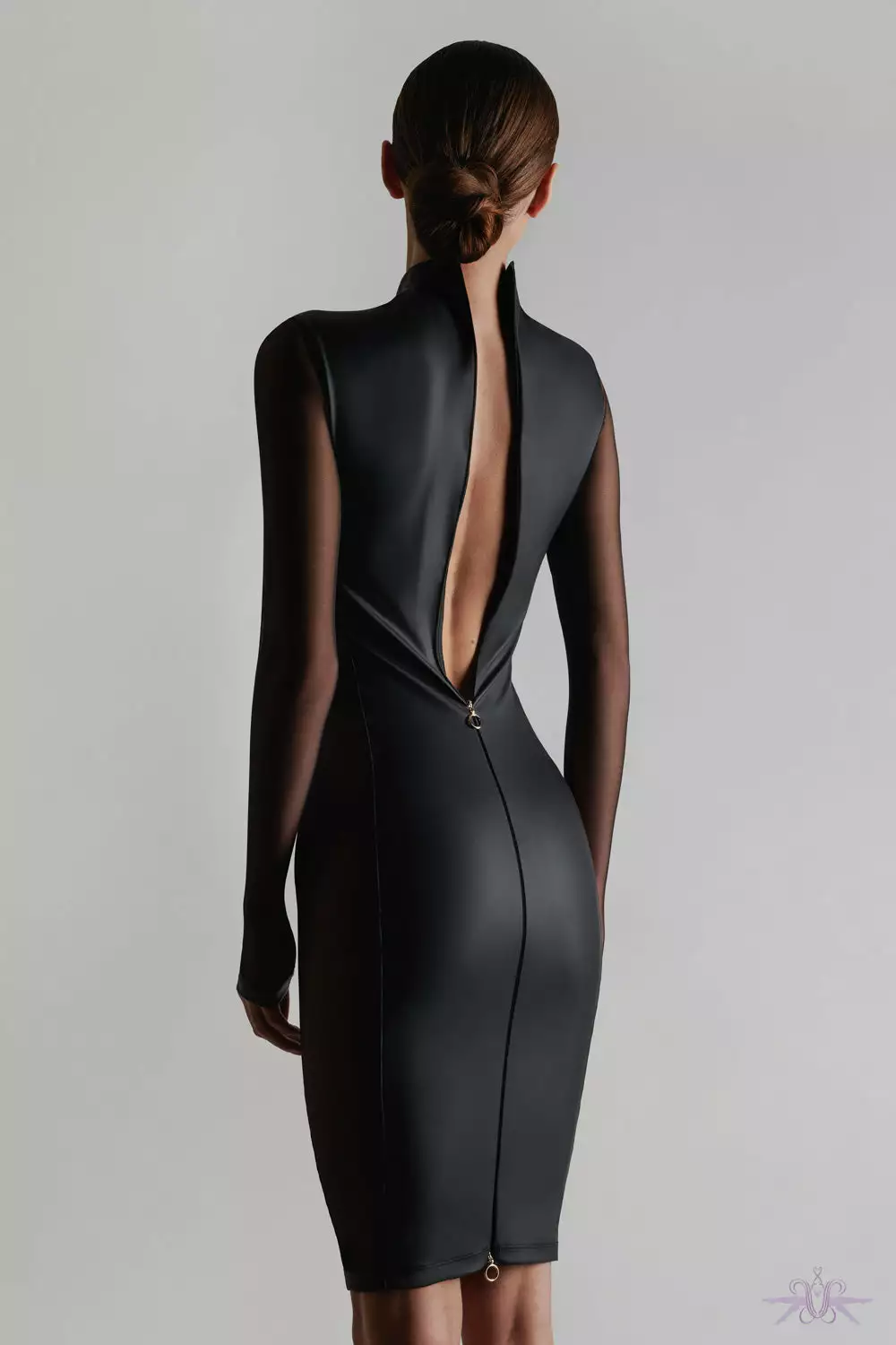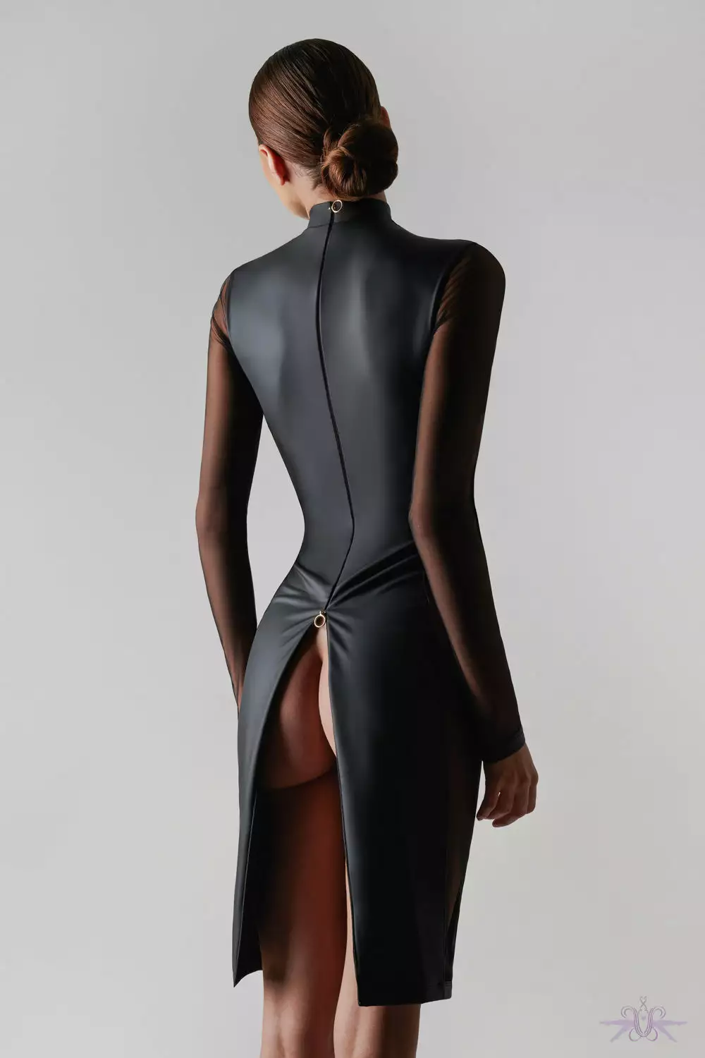 A luxurious matte leather effect and sheer tulle dress with front and back-opening and long sleeves. There are sensual graphic cut-outs on the tulle to show off the arms and reveal the side of the body. It opens at the front and at the back with two two-way zips with a golden ring trim.