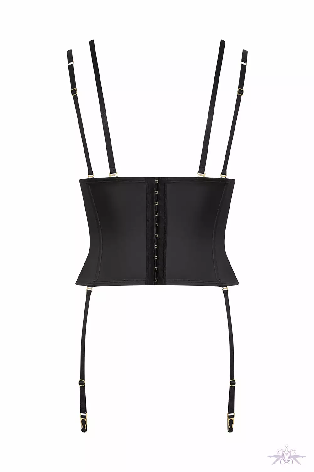 A beautiful matte leather look waist cincher from Maison Close. Really show off your curves in this stunning shape wear that enhances the waist. Suspenders, straps and choker harness are removable and can be adjusted with golden ornamental trims. The flexible vertical whalebones improve structure and support. Adjustable hook-and-eye fastening on the back. Matching items are also available.