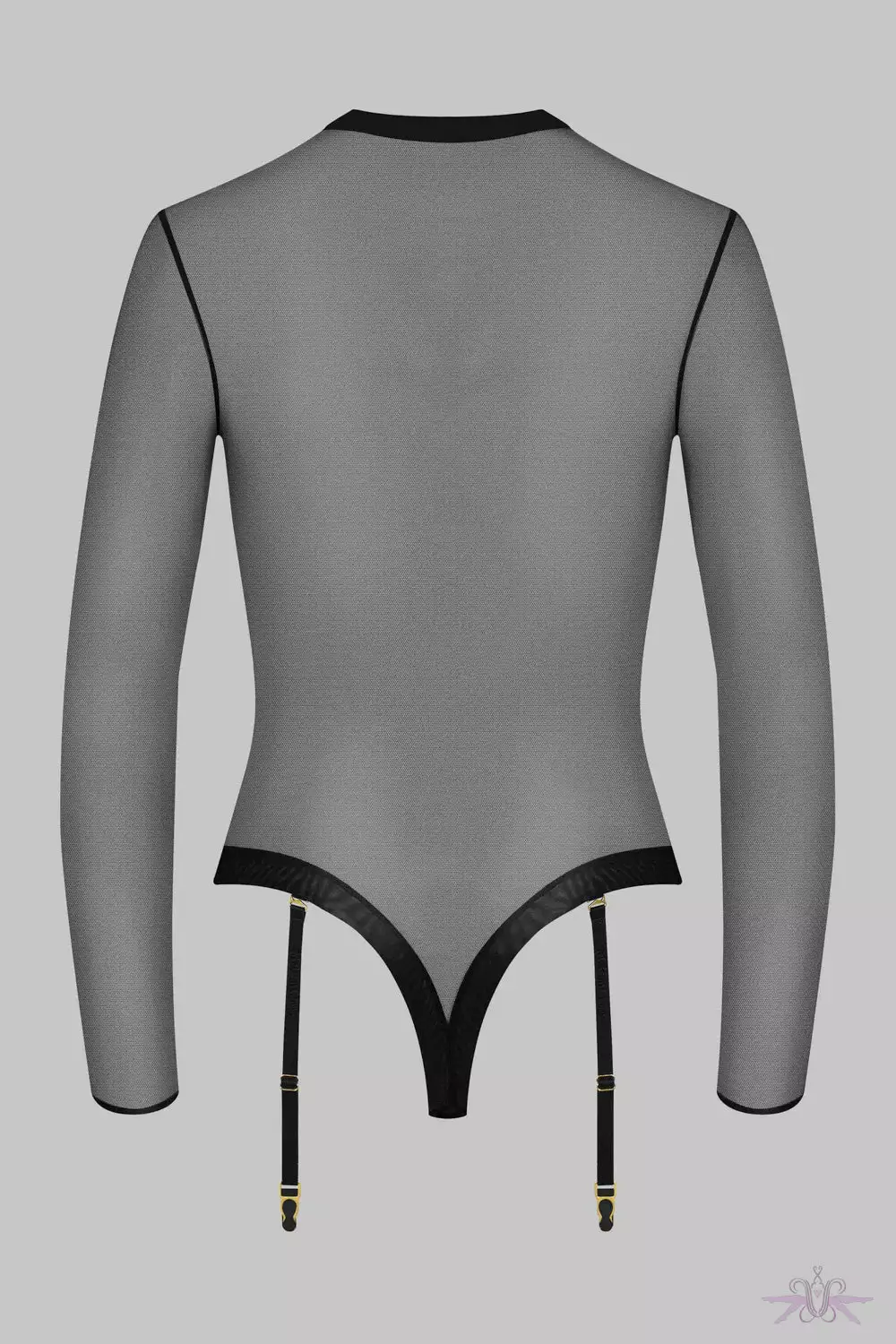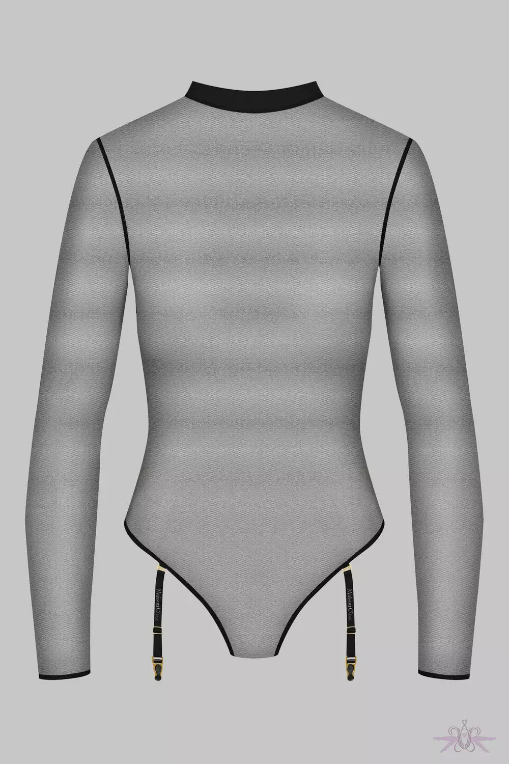 A glamorous long-sleeved thong bodysuit from Maison Close. It features soft tulle with a sheer iridescent appearance. It has four detachable, adjustable Signature suspender straps with gold accents.