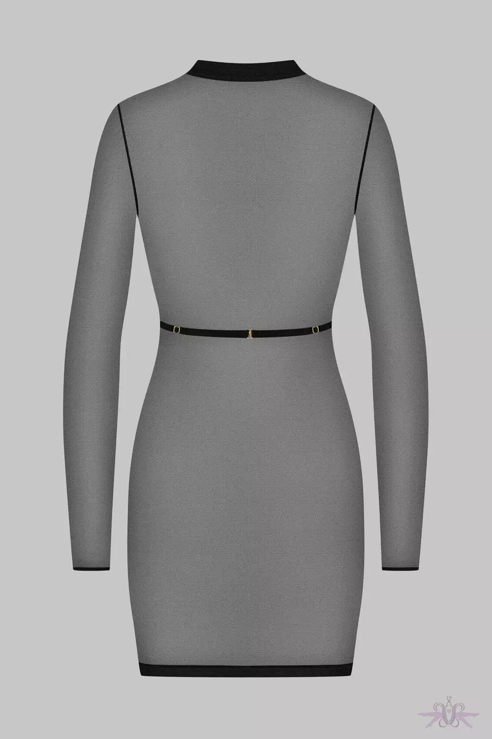 A seductive sheer short black dress from the Corps a Corps collection at Maison Close. It features soft tulle with a sheer iridescent appearance.