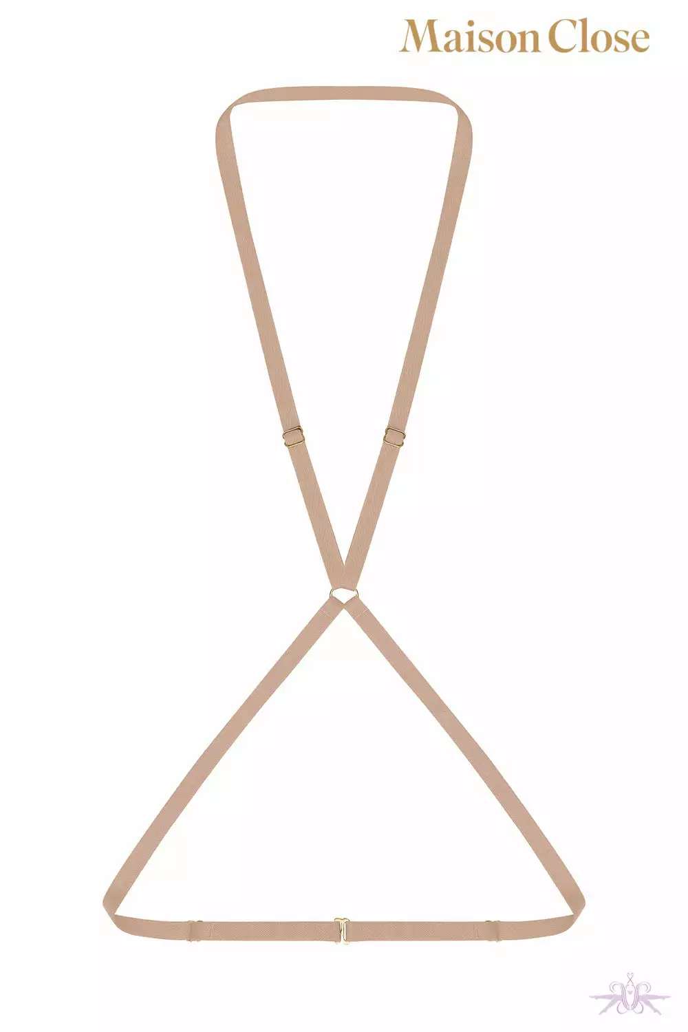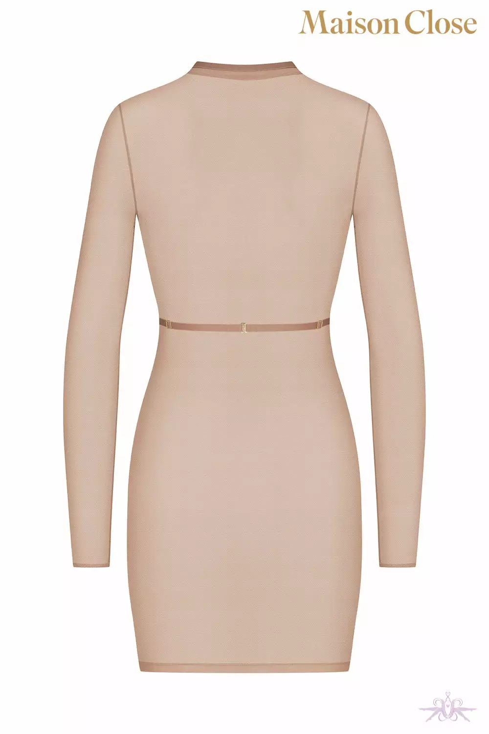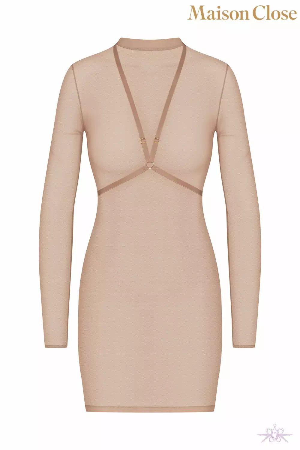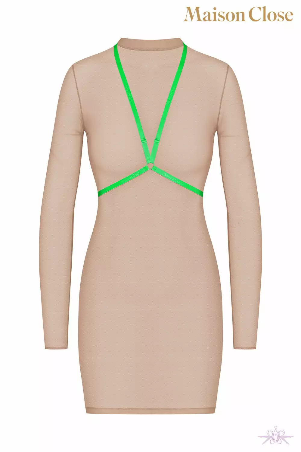 From Maison Close Corps a Corps collection in this seductively sheer dress. Slip on and feel amazing in this second skin effect dress with a high neckline and long sleeves. Wear it over underwear or your swimwear to suit whichever occasion. It comes with two harnesses one in green and one in nude to suit the mood that day. Matching thong available.