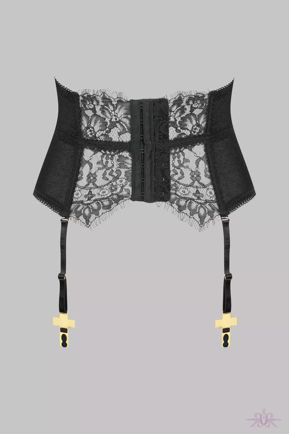The sumptuous blend of fabrics and textures is perfect. They cover the hips with mesh, which is trimmed with floral lace. There are four adjustable suspender straps which are removable and each are decorated with the signature gold cross.