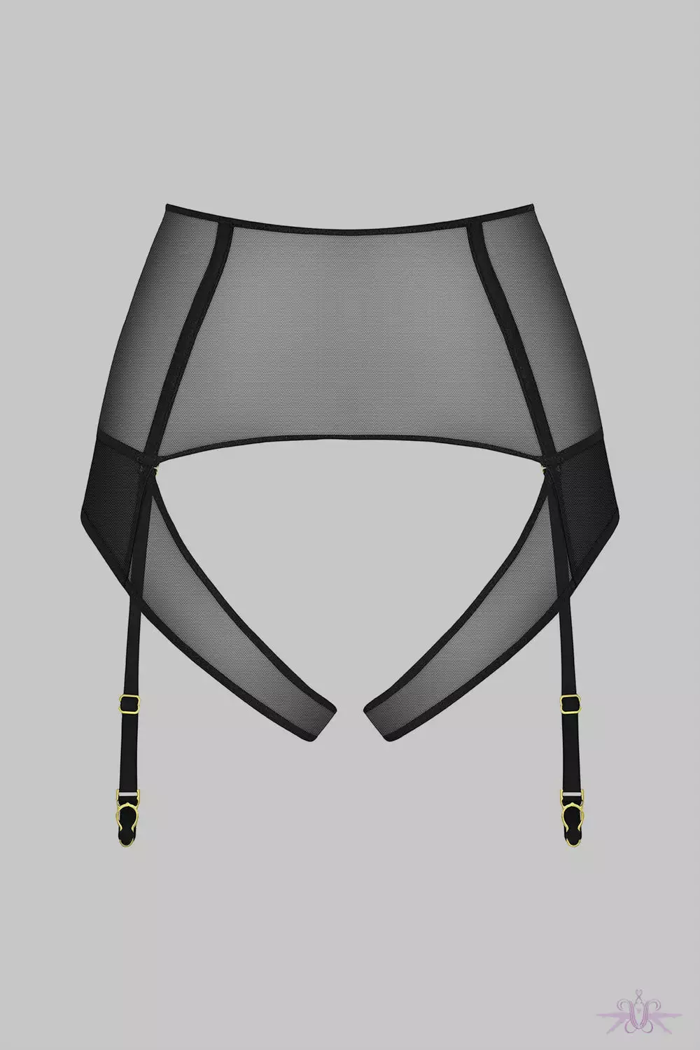 A glamorous high-waist tanga in sheer mesh from Maison Close. This tanga has flexible boning with two superimposed front panels which open at the crotch to reveal beautiful heart shaped derriere. There are removable and adjustable garters.