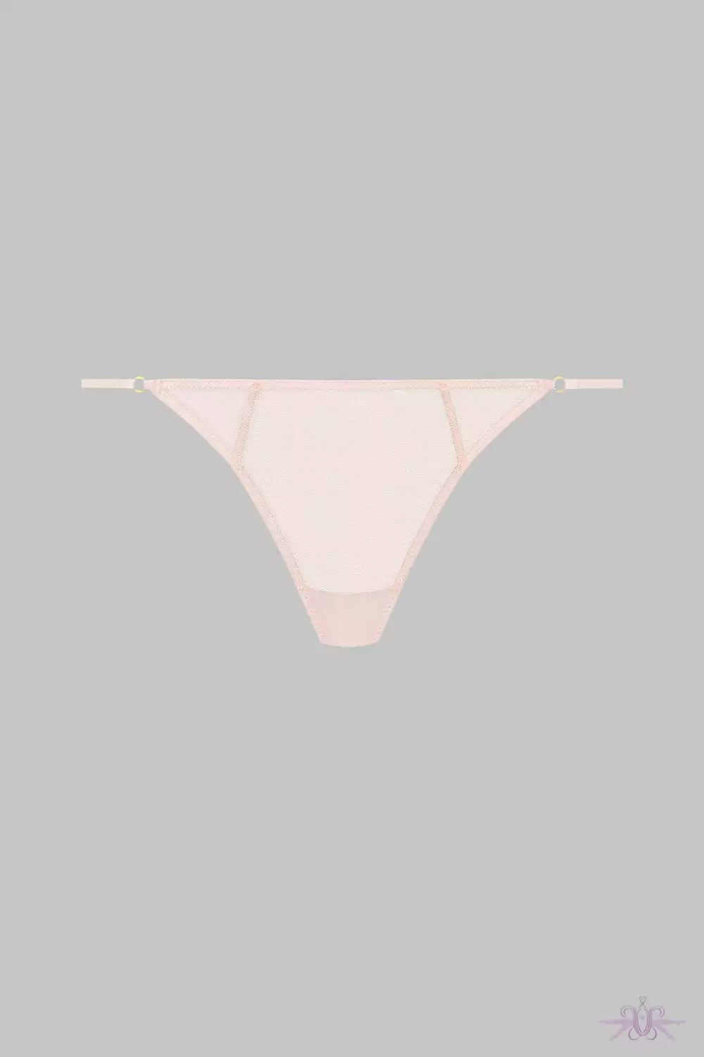 A sensual mini thong in sheer mesh from Maison Close. The delicate elastic bands connected by a golden ring in back add a glamorous touch.