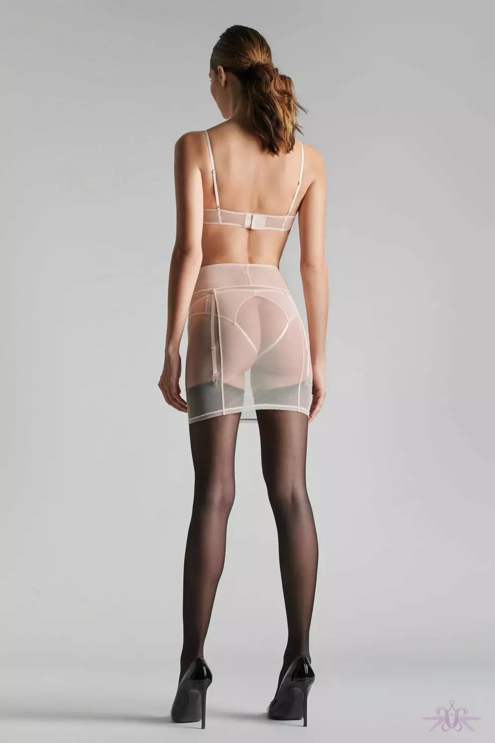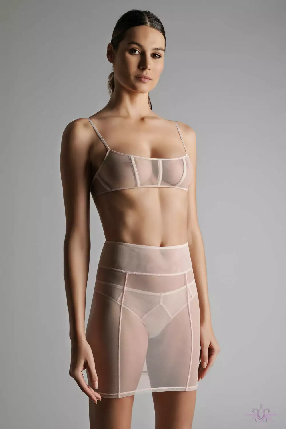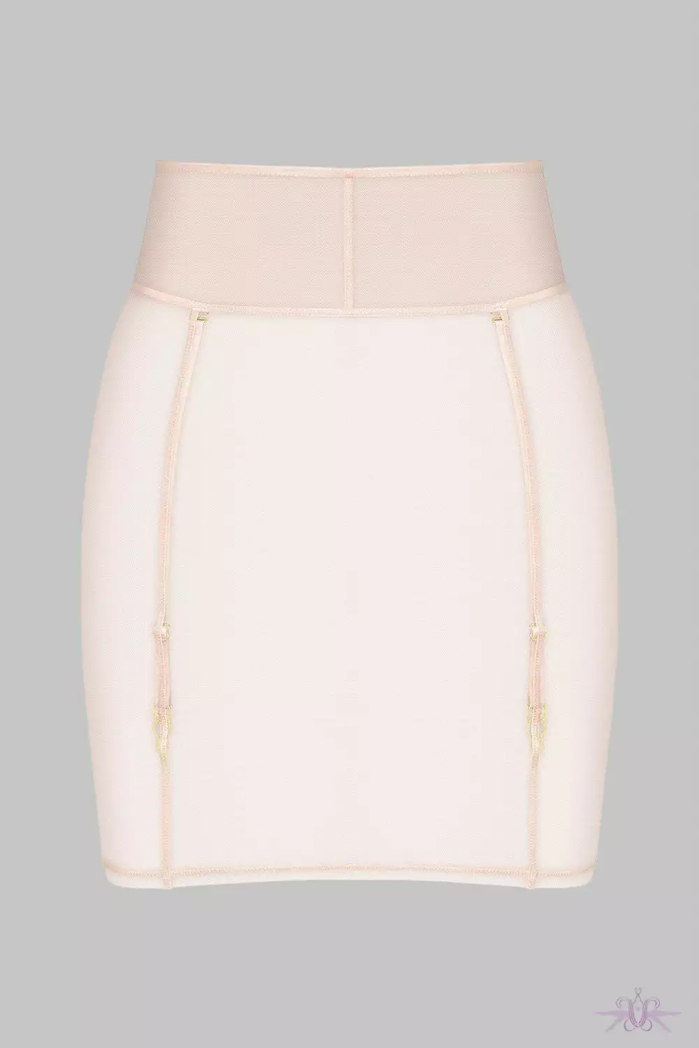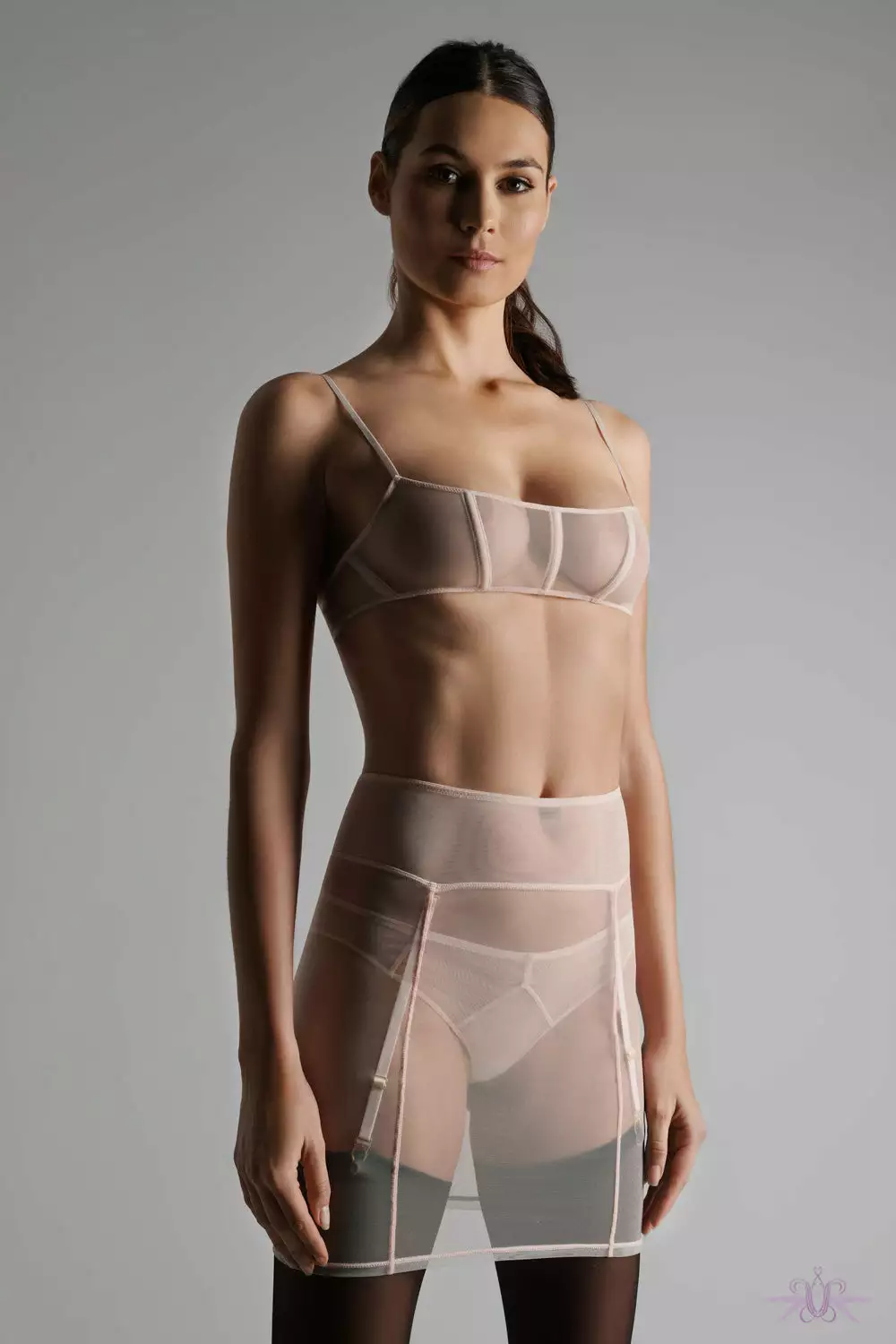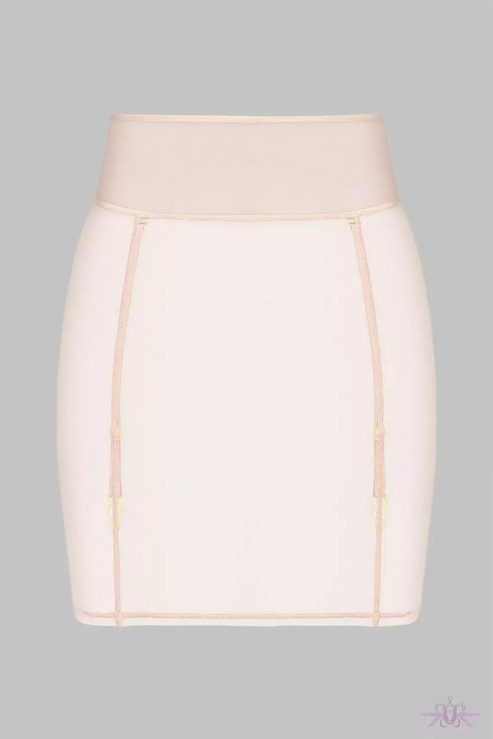 A stunning short garter skirt in sheer mesh from the new collection at Maison Close. This seductive skirt has a snug fit and good under clothing. The cross seams coordinate with the removable garters. A gorgeous slip skirt to wear over other pieces in the collection.
