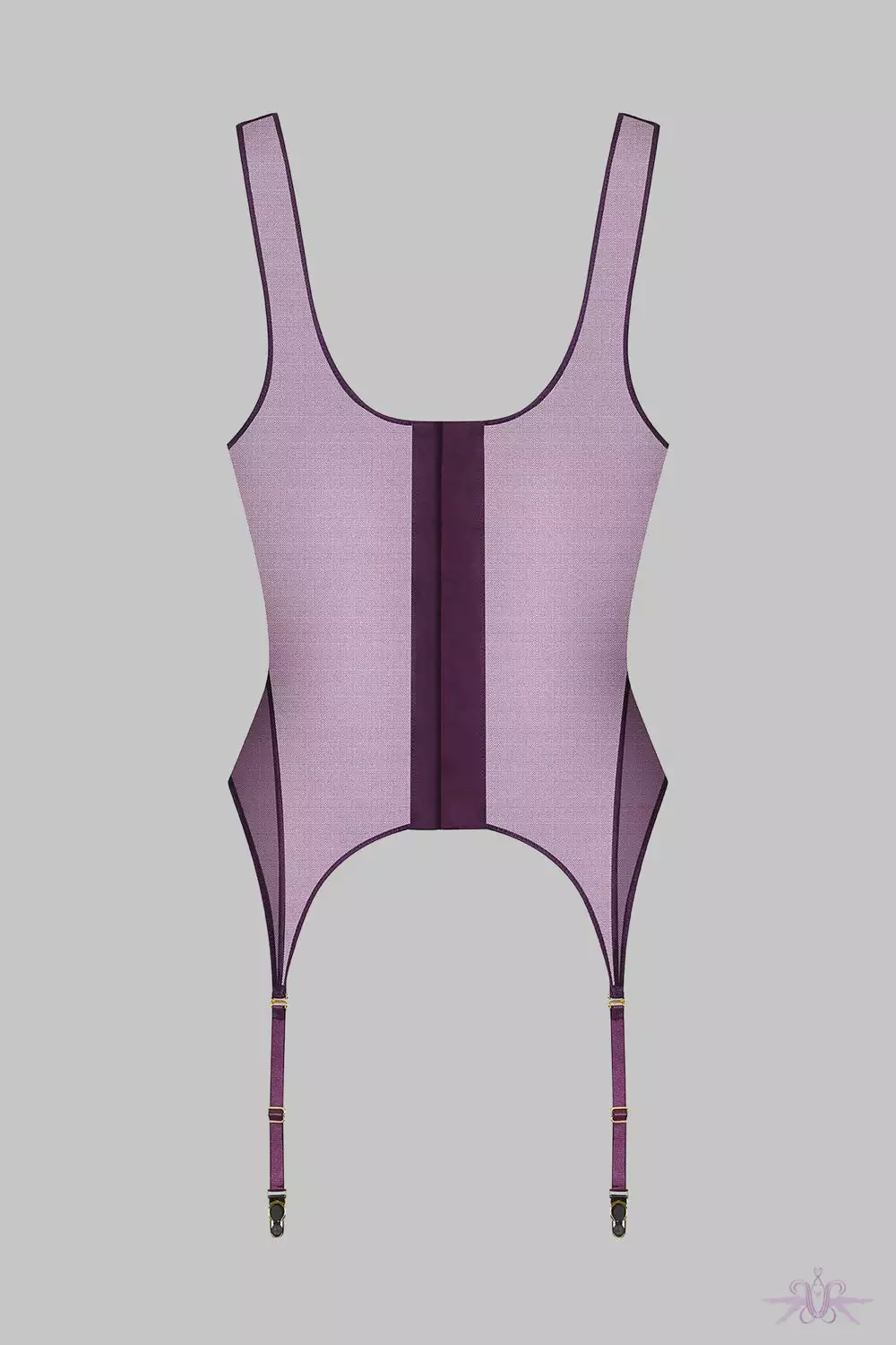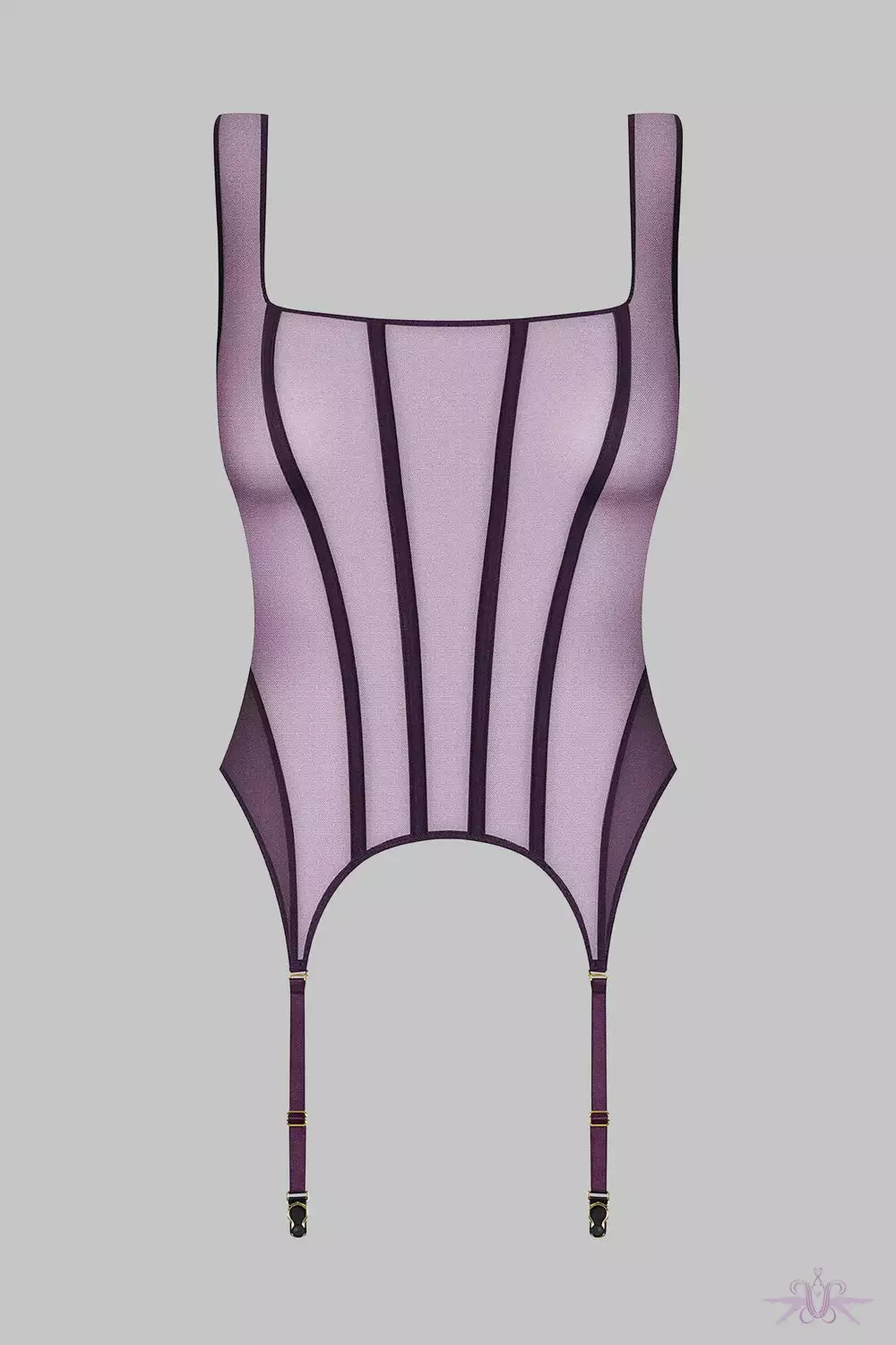 A seductive corset top with suspenders in sheer mesh form Maison Close. This vintage style French corset has a straight neckline and transverse seams which is structured by flexible vertical boning. Lined tulle on the sides enhances the hips, extended with adjustable and removable garters. Sleek and subtle hook and loop back closure.
