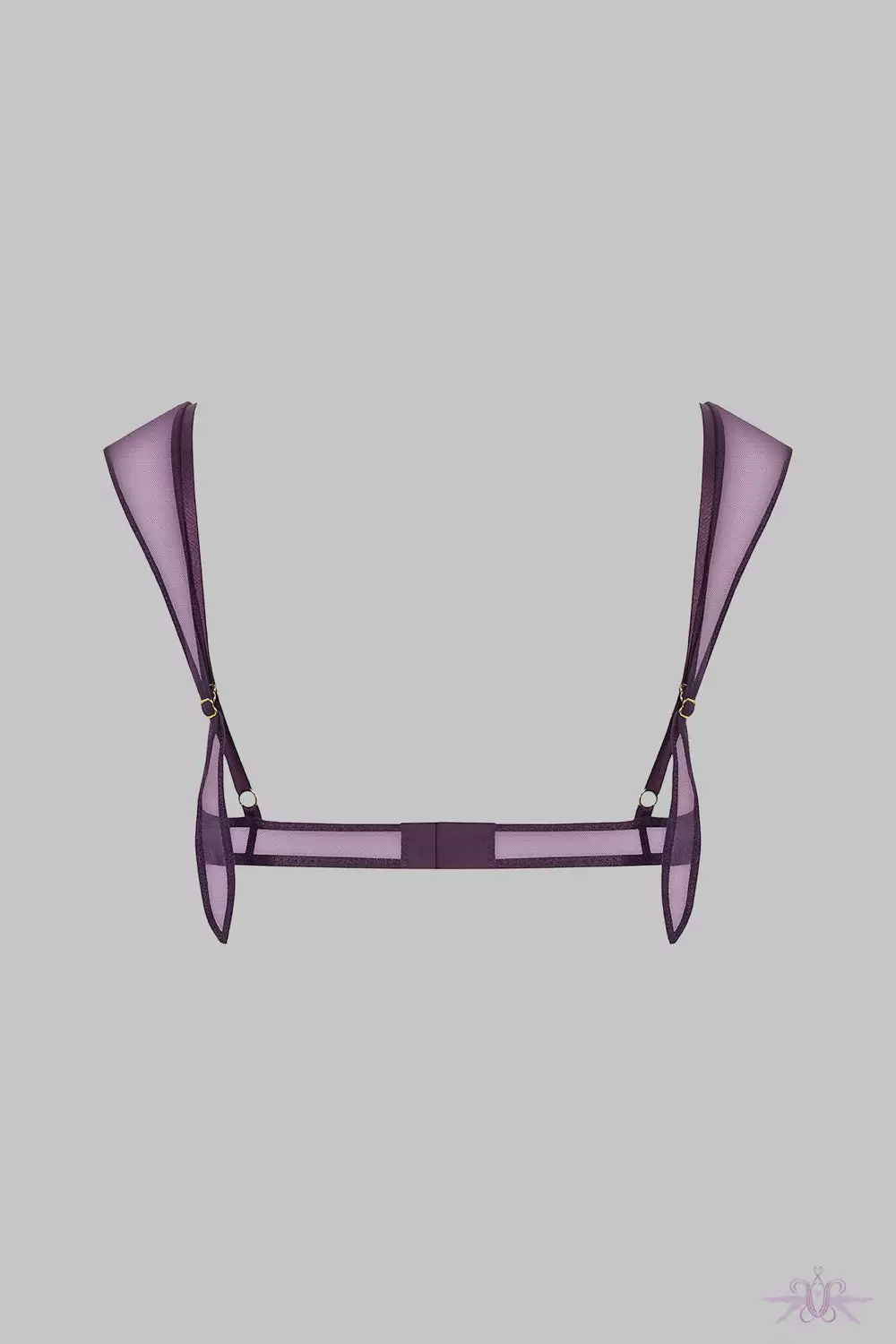 An extremely seductive naked breast scarf bra in sheer violet orchid mesh. It is underwired enhancing the bust. The mesh scarf to tie as you wish: around neck to drape nicely over the breasts or in back for a naked breast look.