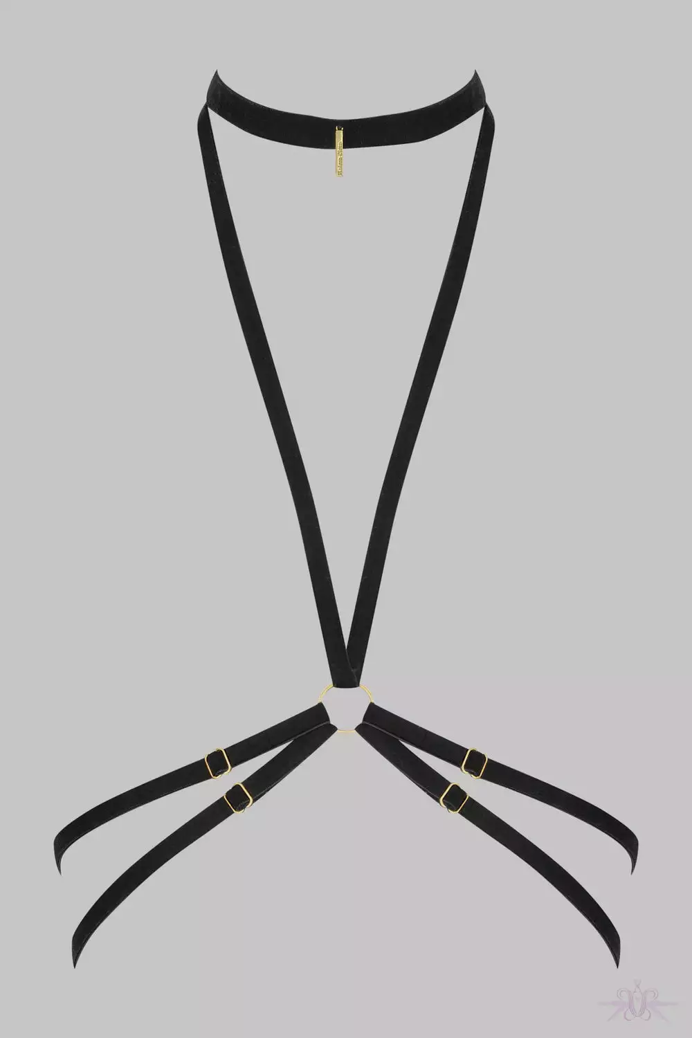 A luxurious velvet Harness from the Le Fetiches Collection at Maison Close. The harness is adjustable and can be worn with other le fetiches items to complete the look. The harness closes at the back, passes between the bust and ends around the neck, creating a choker effect embellished by an irresistible golden jewel.