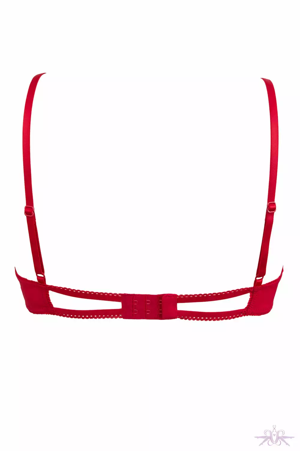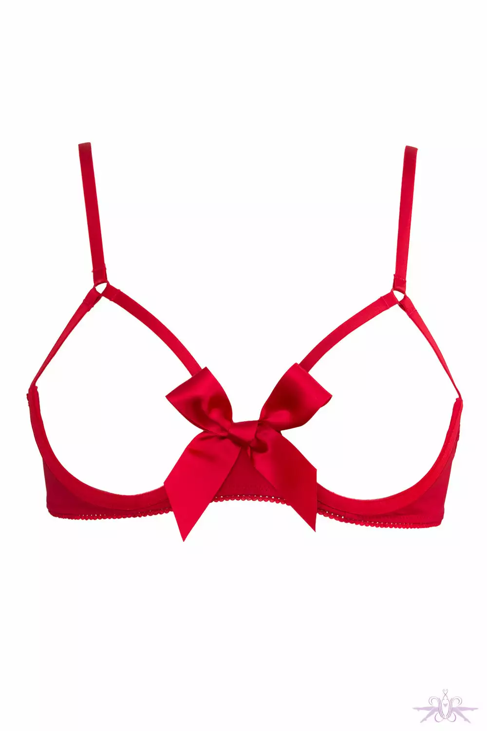 Feminine and gorgeous this beautiful red cupless bra from French design house Maison Close is stunning. The super soft fabric, adjustable straps and detachable bow make this a perfect choice for everyday, or for the boudoir. Complete the look with the matching red open panty, naked shorty, thong and garter belt.