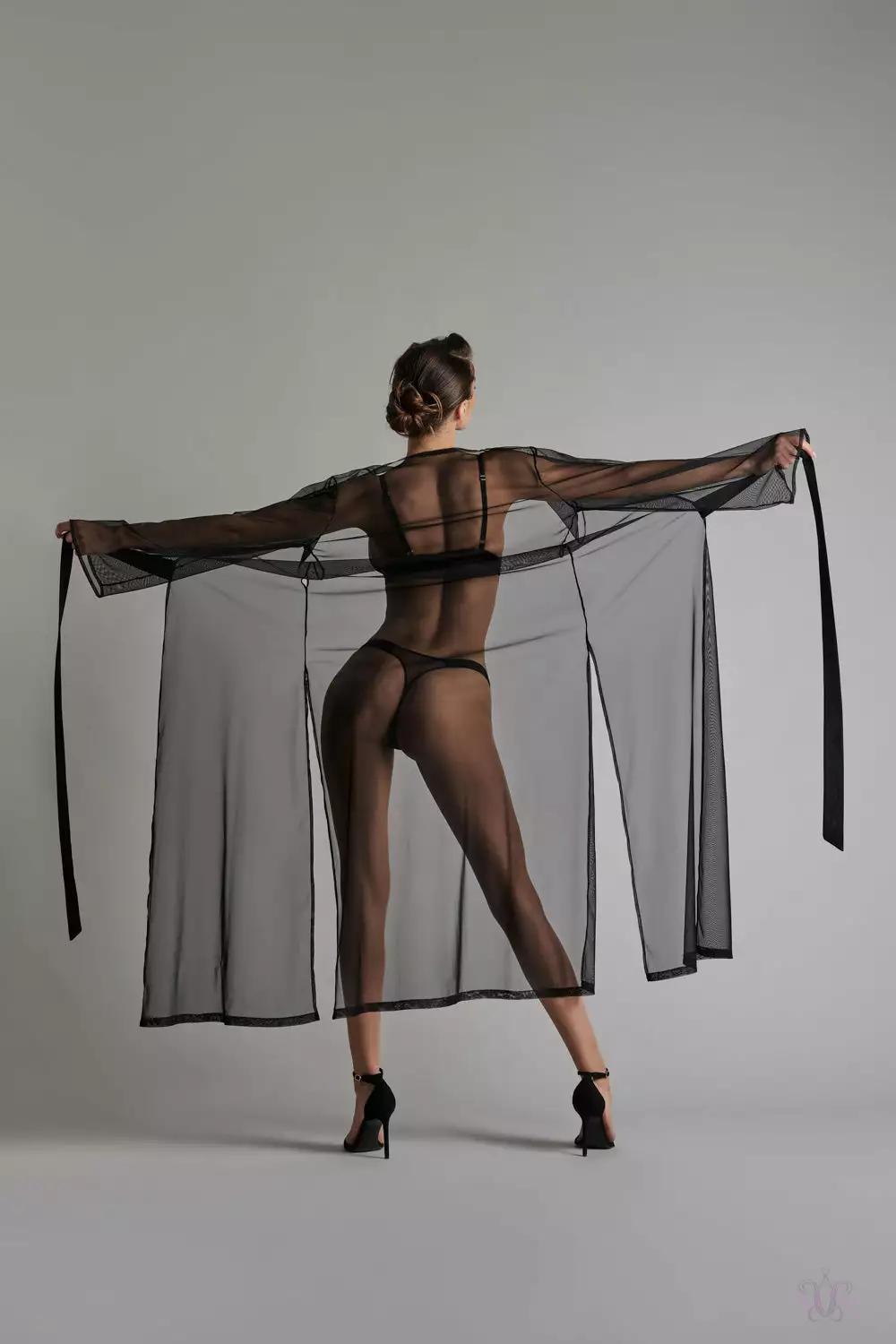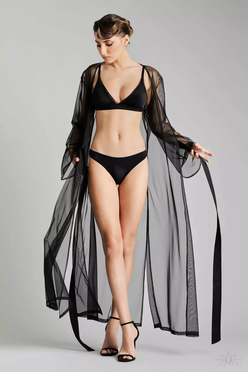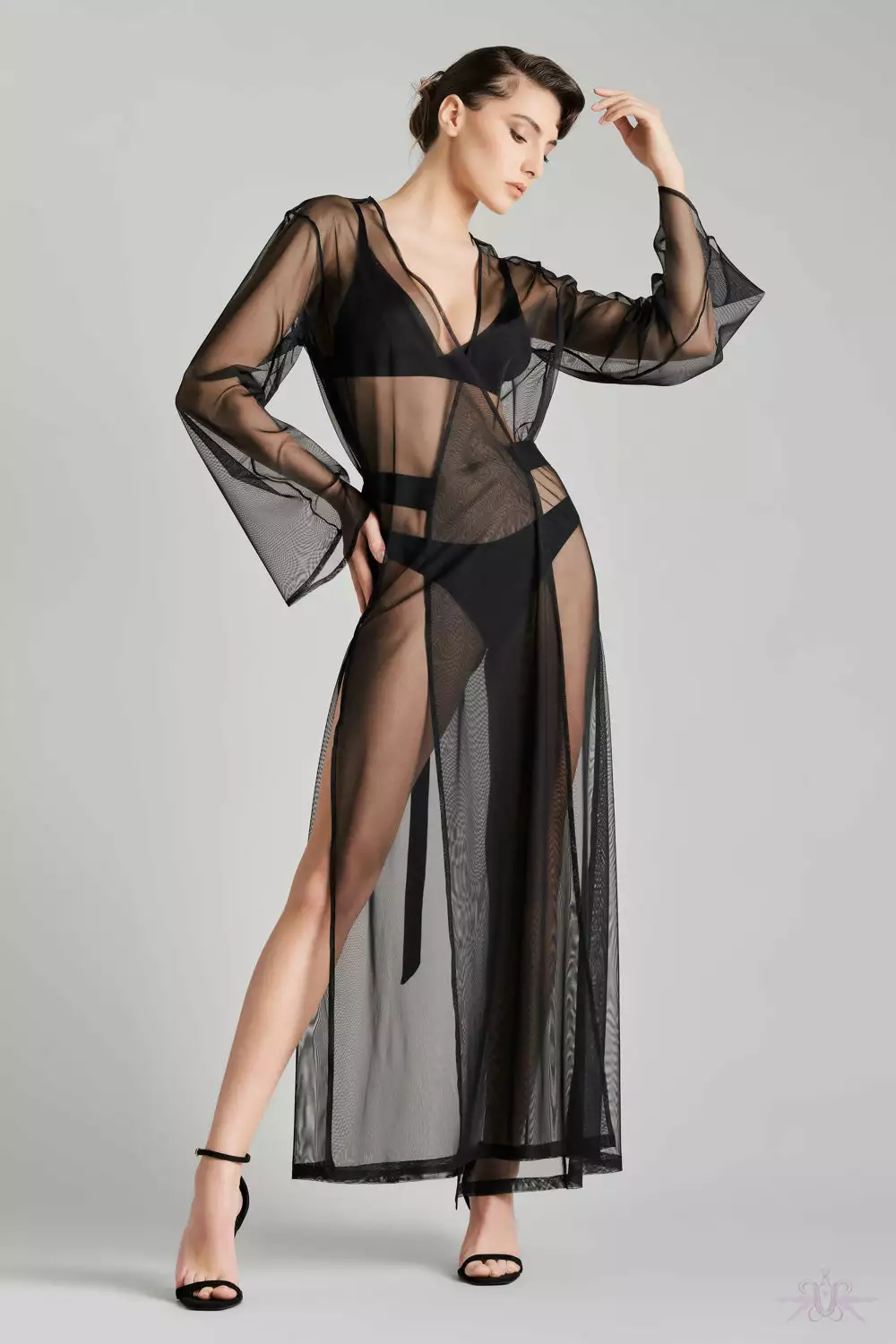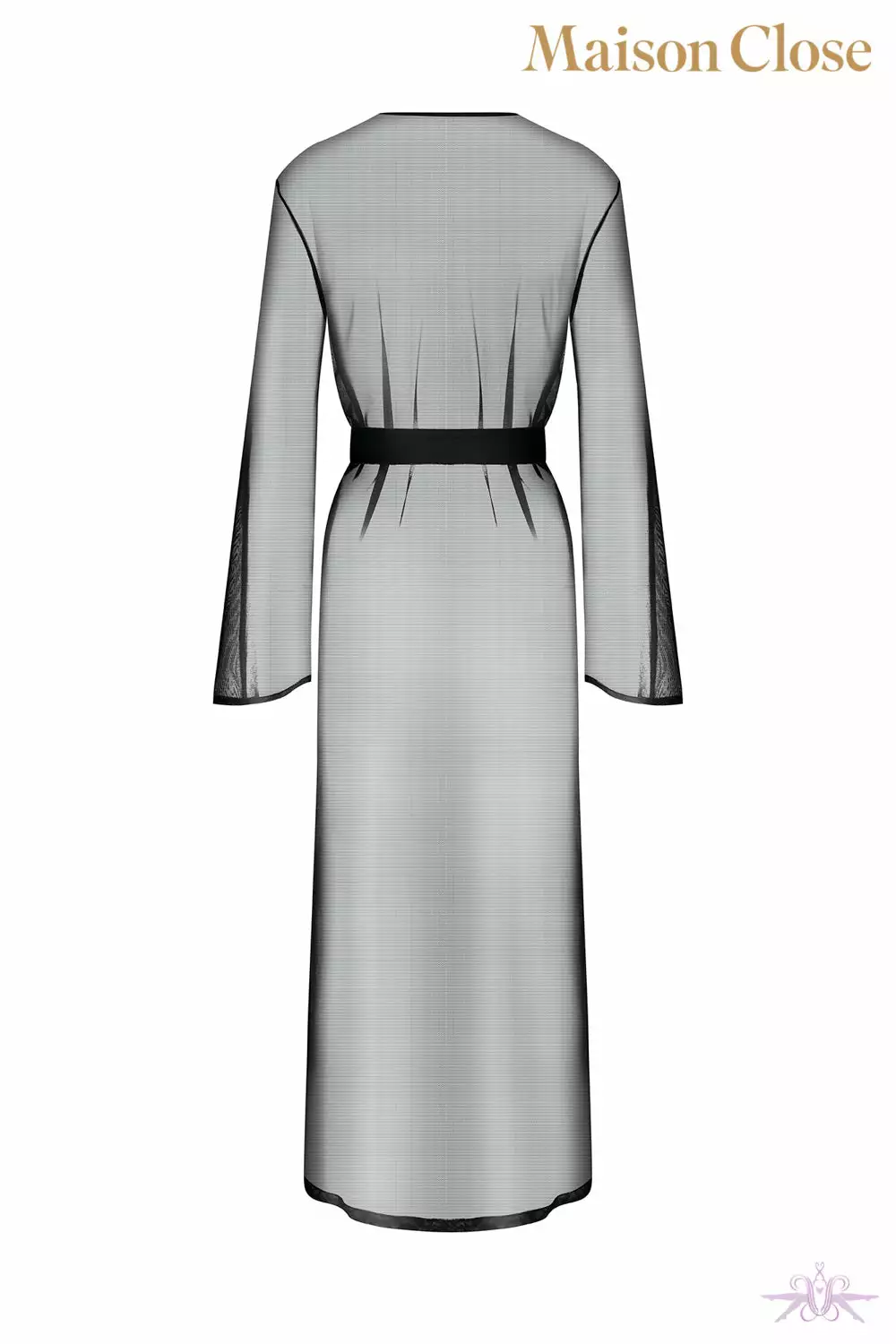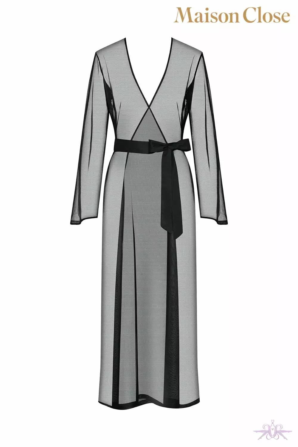 A luxurious long sheer kimono from the Madame Reve collection at Maison Close. This transparent tulle gown reveals the body in such elegance and grace. Its gorgeous long wide sleeves and and two discreet side slits bring style and sophistication to your lingerie and nightwear. Matching triangle bra and brief are available.