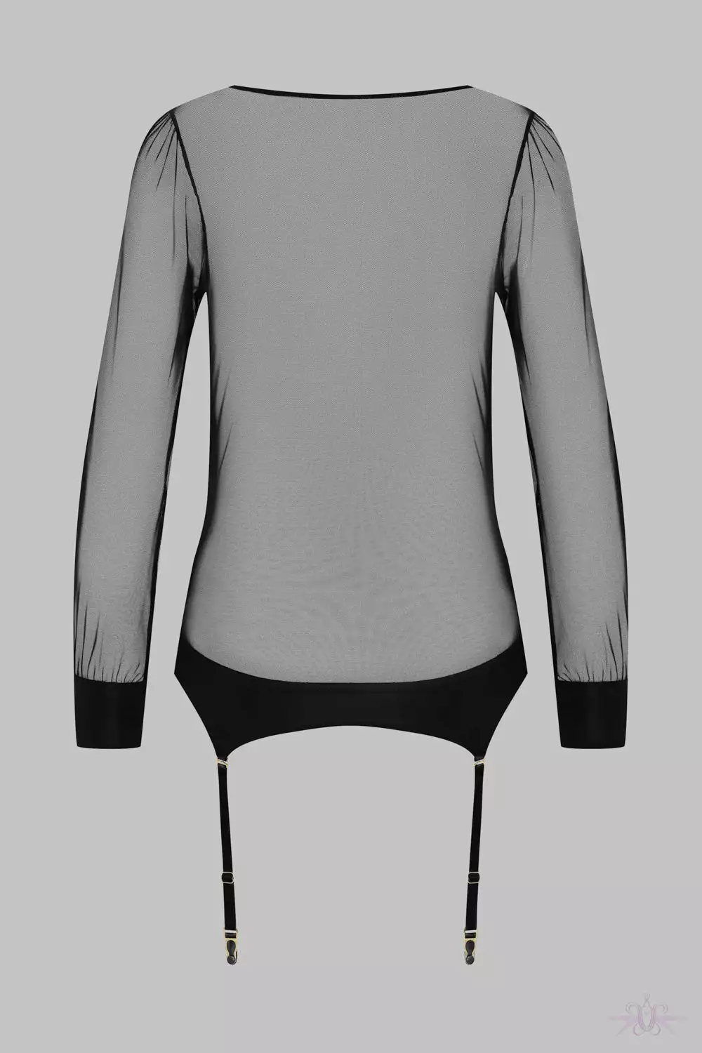 A decadent long sleeved bodysuit from the Madame Reve collection at Maison Close. This bodysuit in opaque microfiber has a sheer mesh back and long floaty sleeves with slight gathers at the shoulders. The four suspender straps are adjustable and removable making this a gorgeous versatile piece of lingerie.