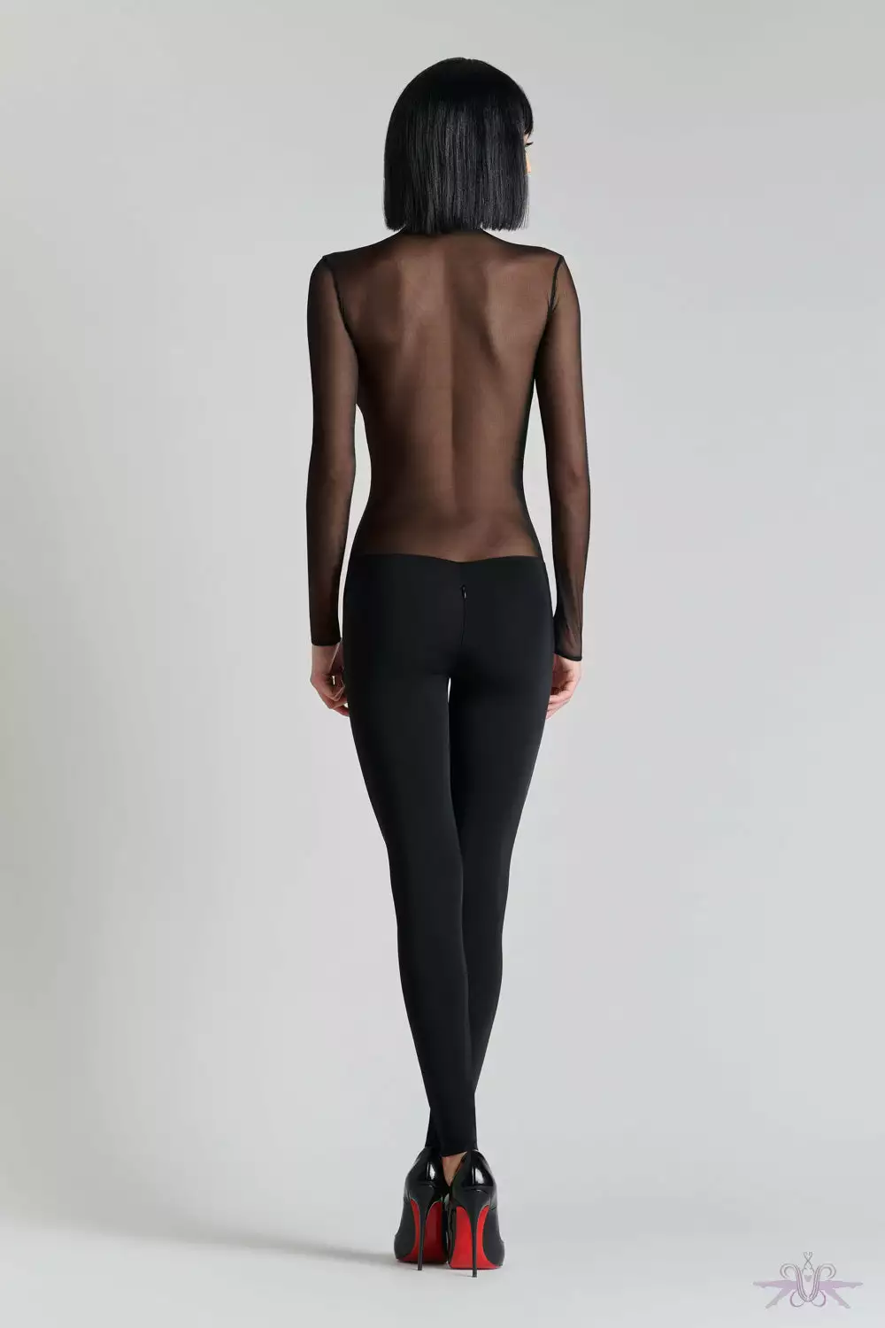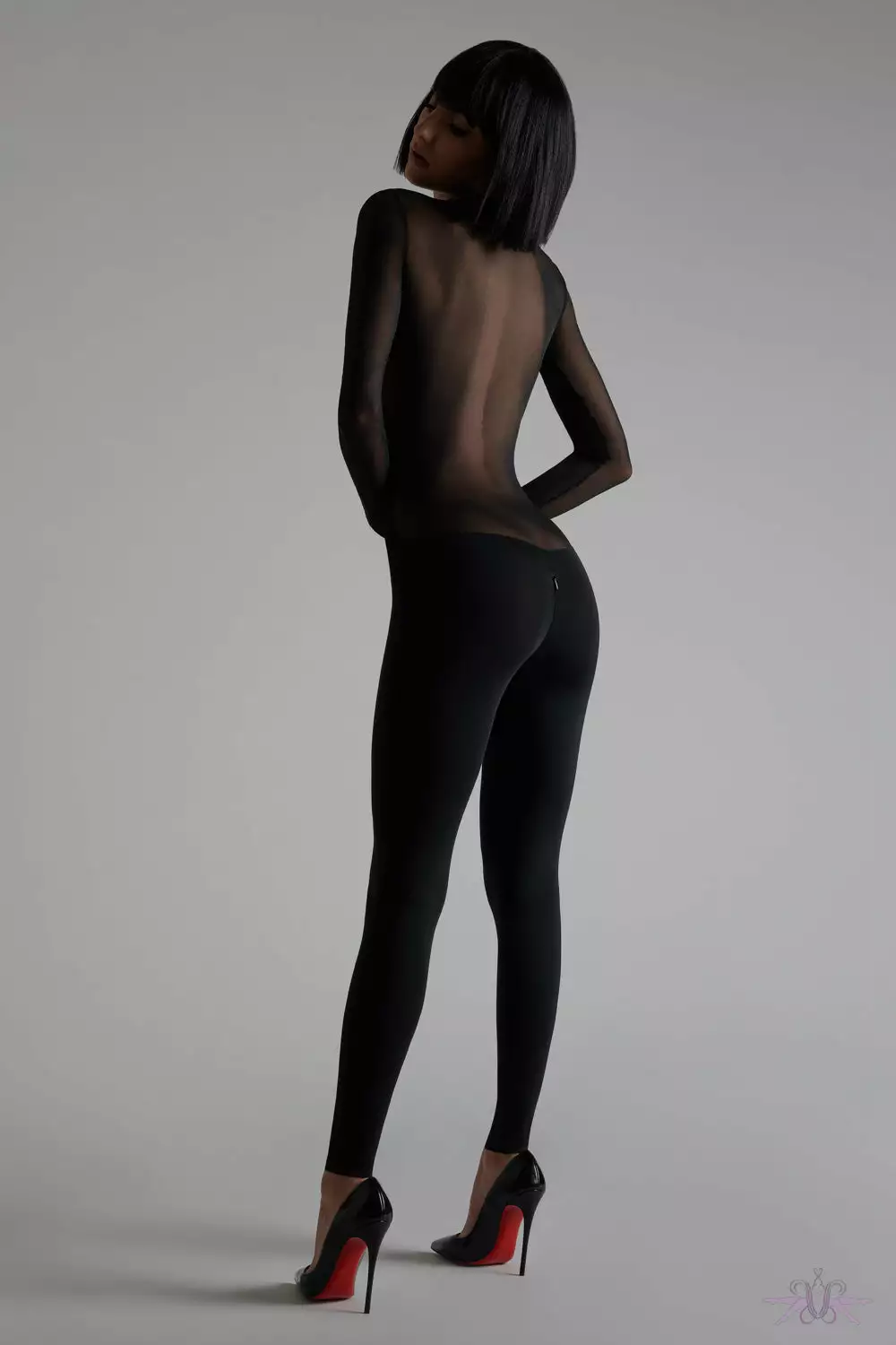 An alluring and seductive catsuit from Maison Close. This close fitting catsuit envelops the curves with a soft and ever so comfortable microfibre. It emphasises the silhouette and flatters the assets like a second skin. Its low cut highlights the bust. The back and the long sleeves are so chic with their transparency. At the front there is a zip which goes to the bottom.