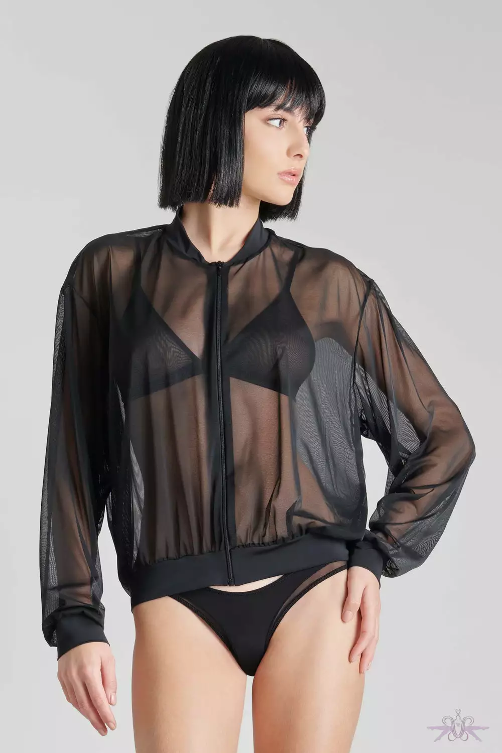 Fluid and light, this classic combines style and absolute comfort. It owes its charm to its mesh fabric with subtle transparency. The bomber features a tone-on-tone zip on the front. Its waist and cuffs are made with an opaque microfiber for a perfect fit.
