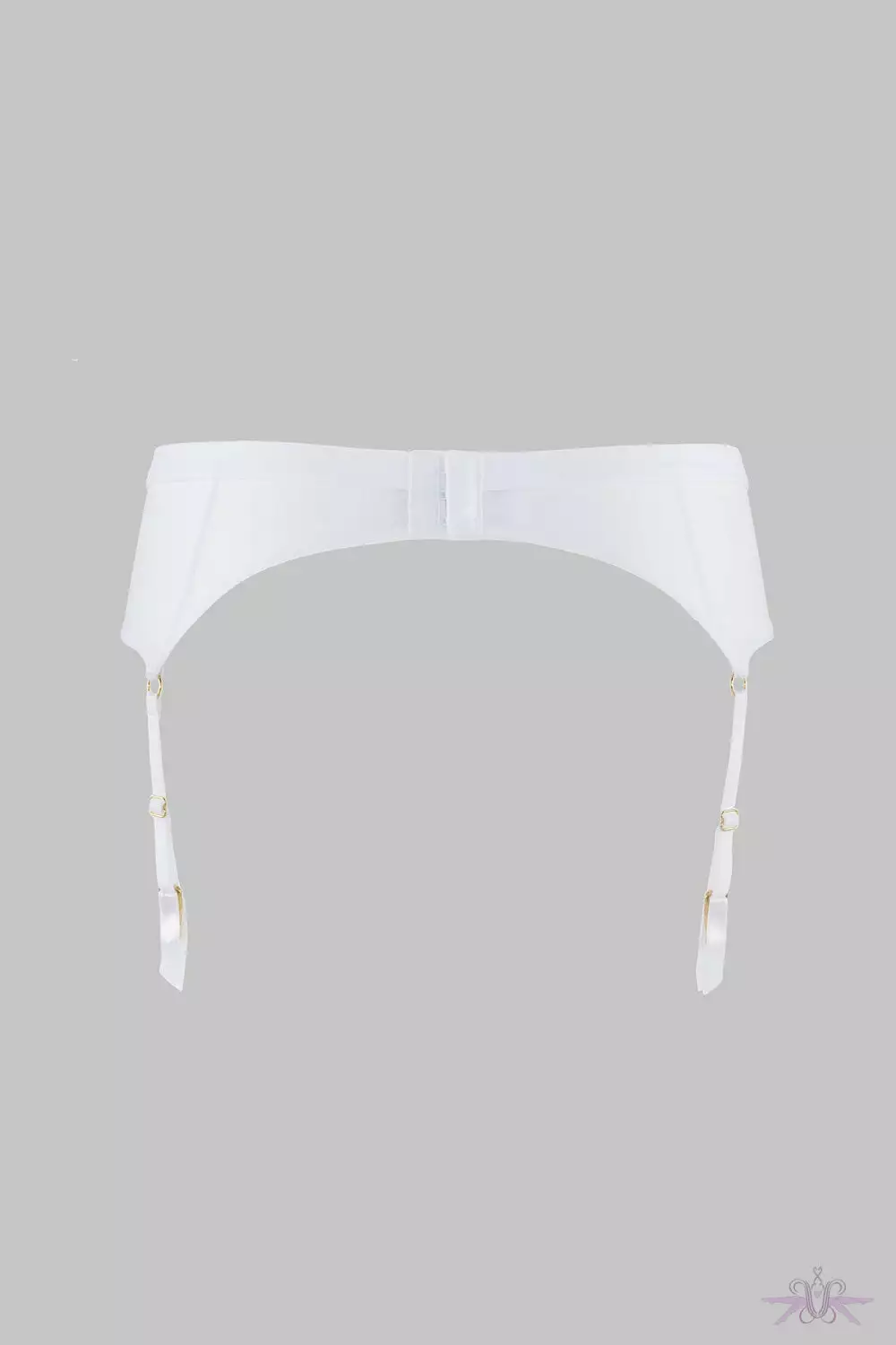 The garter belt from the Pure Tentation collection at Maison Close is beautiful. This sheer white suspender belt has four adjustable straps and a hook and eye fastening at the back for optimum fit. Matching Thong, Shorty, and Triangle Bra.
