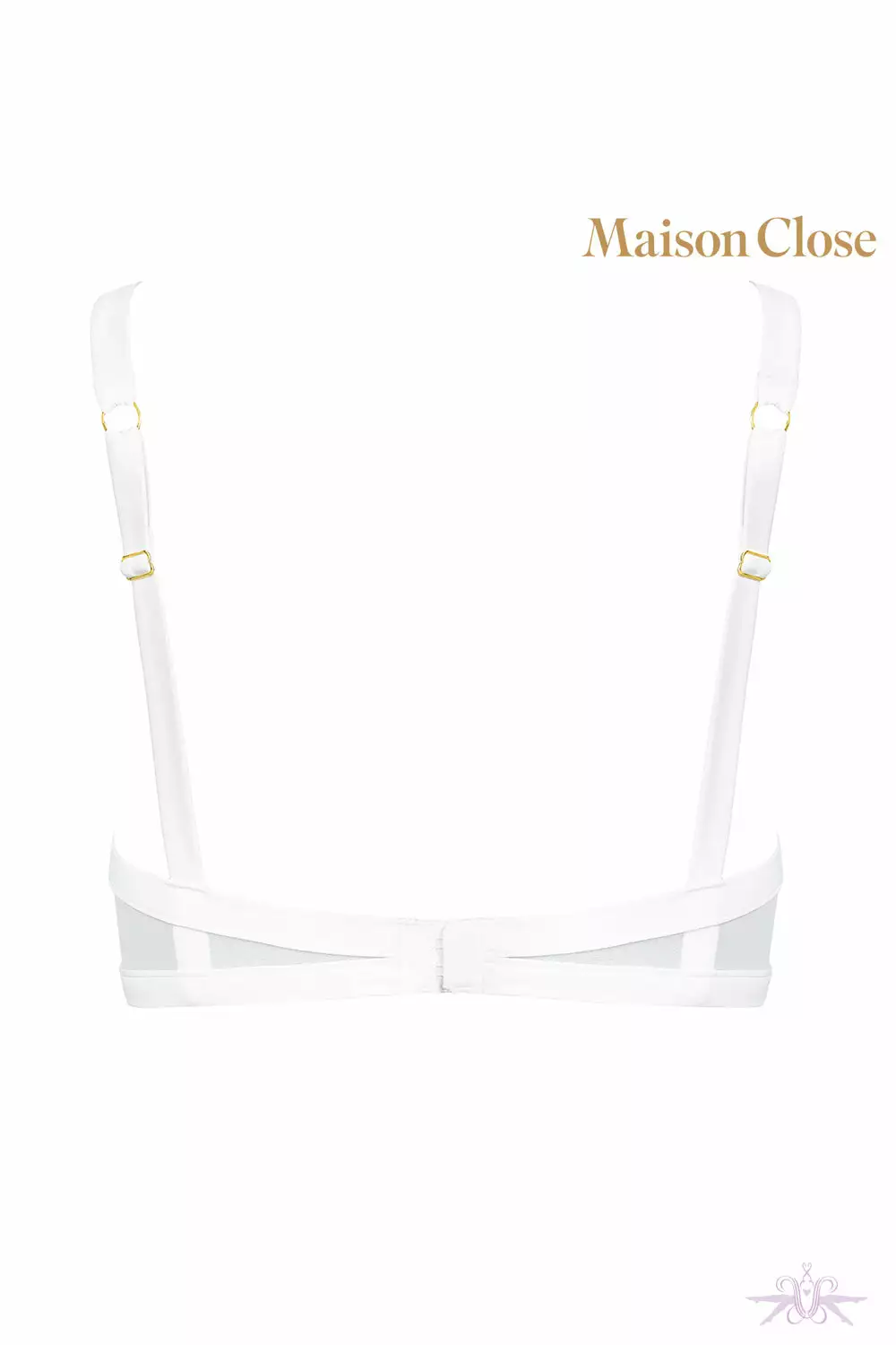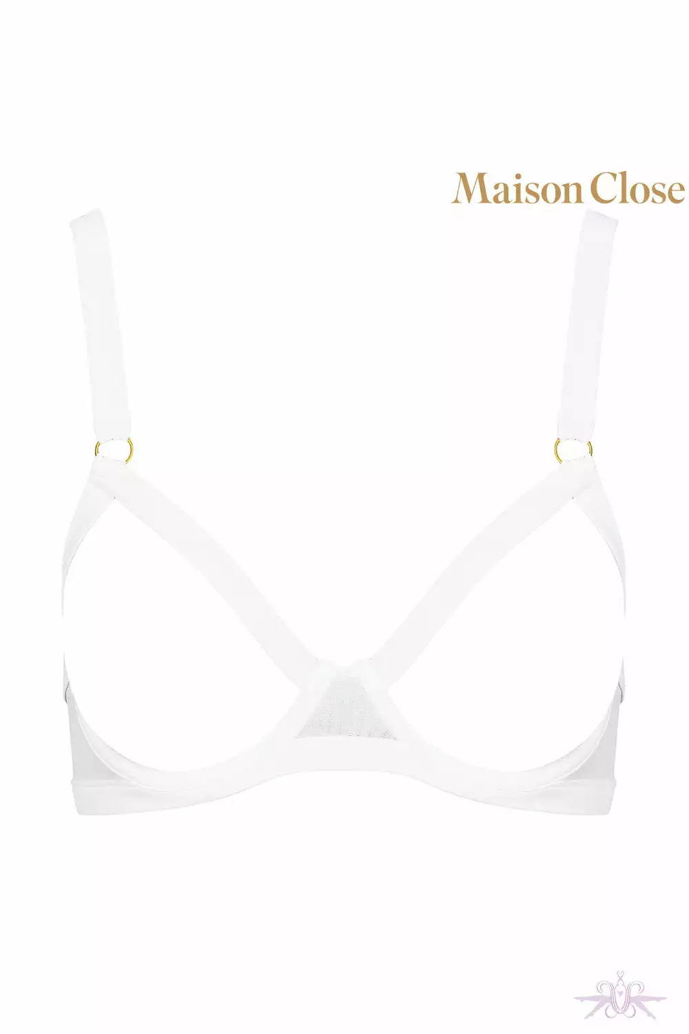 Daring and suggestive is the naked breast bra from Maison Close. It features a naked breast cut offering audacity and support. This seductive underwear is incredibly soft with its extraordinary refinement. A semi-transparent tulle panel decorates the edging and the adjustable straps ensure a good fit. To increase desire wear with the matching high hips thong.