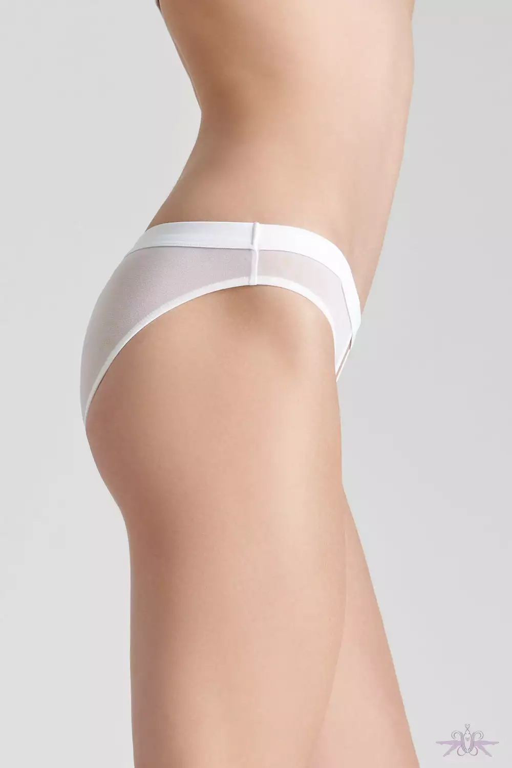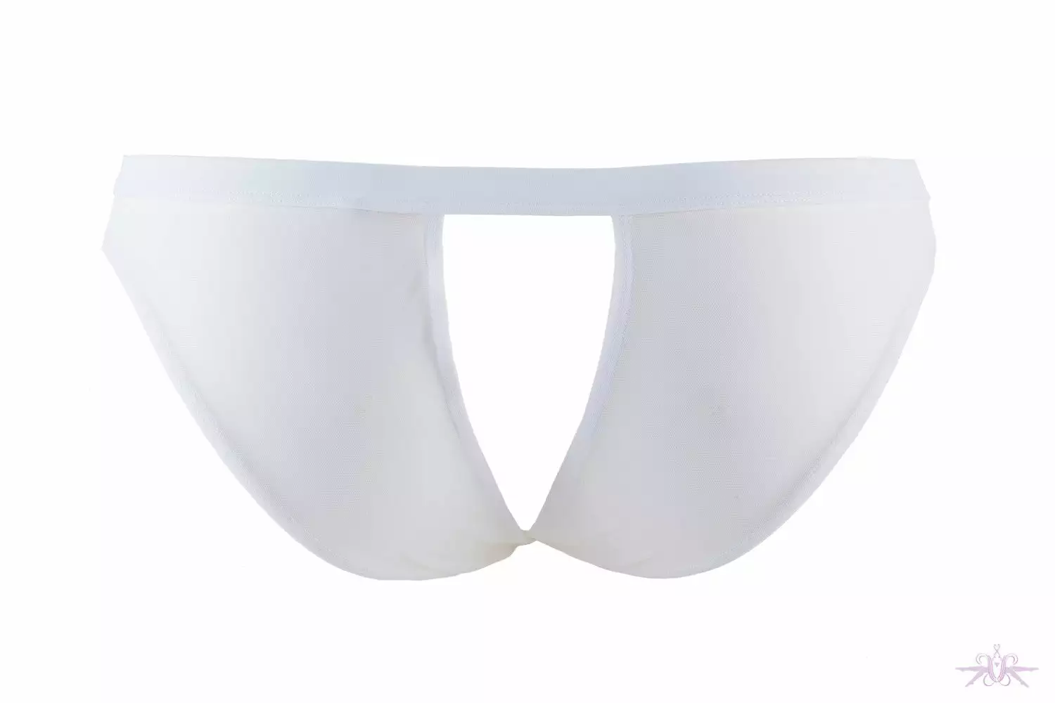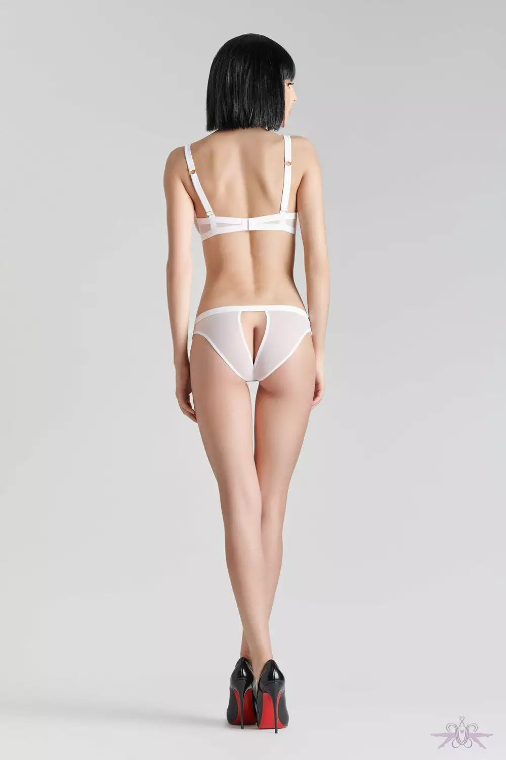 A beautiful white open panty from the Pure Tentation collection at Maison Close. This ultra sheer tulle panty has a playful crisscross design creating front and back openings. Matching Bra is also available.