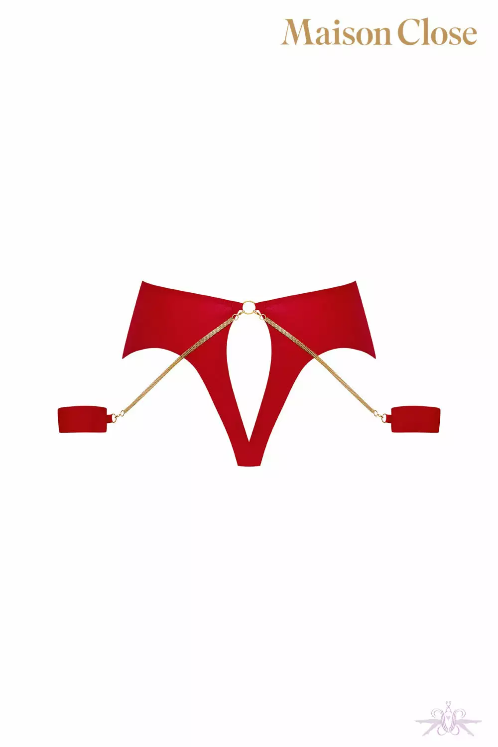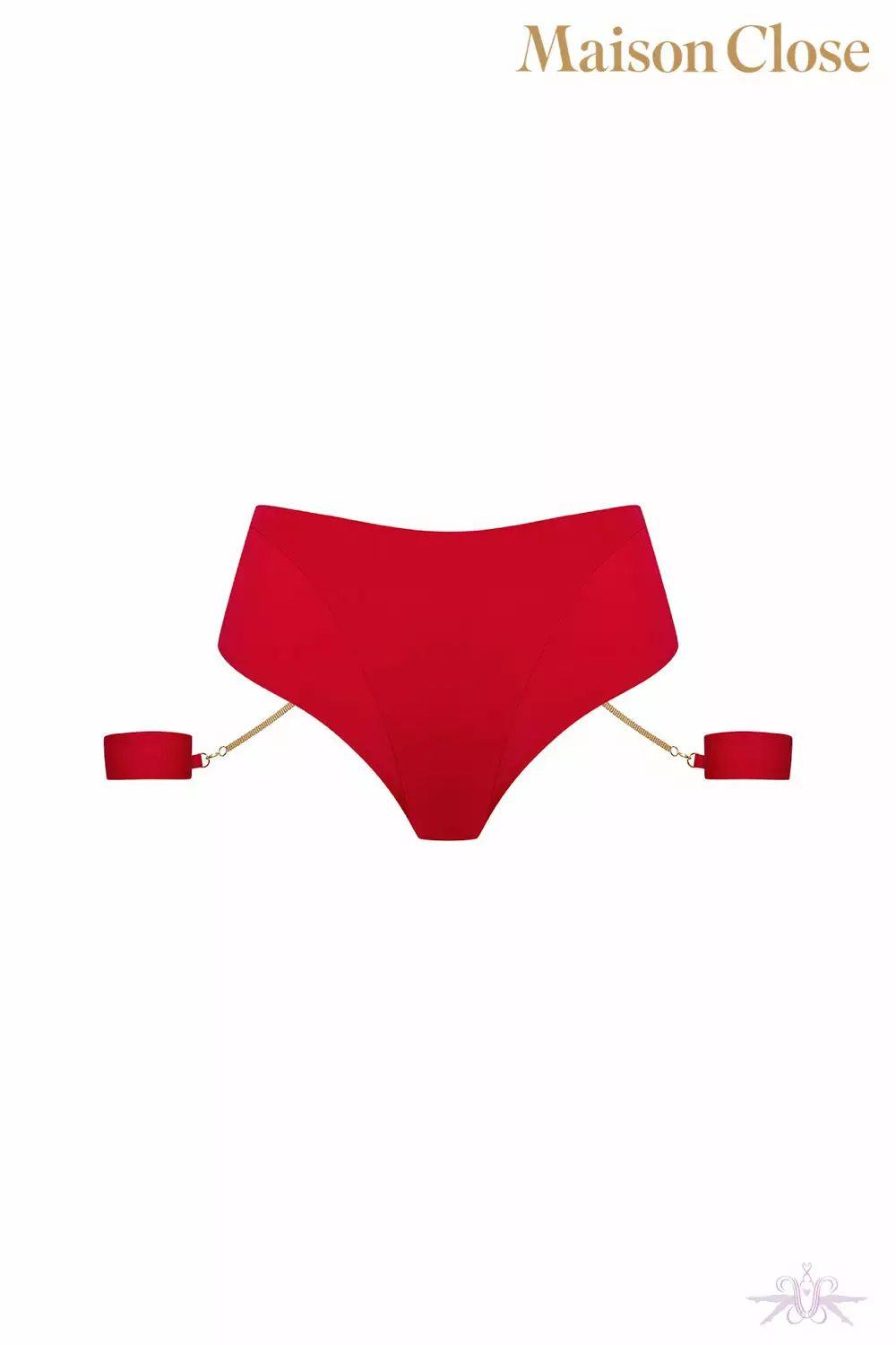A sexy high waist thong from Maison Close. This red thong is part of the Tapage Nocturne collection and is crafted from super soft microfibre. It has a gorgeous seductive peekaboo cut to the back which allows the gusset to be opened. This style flatters your curves and the gold tone cuffs are detachable. Matching triangle bra available.