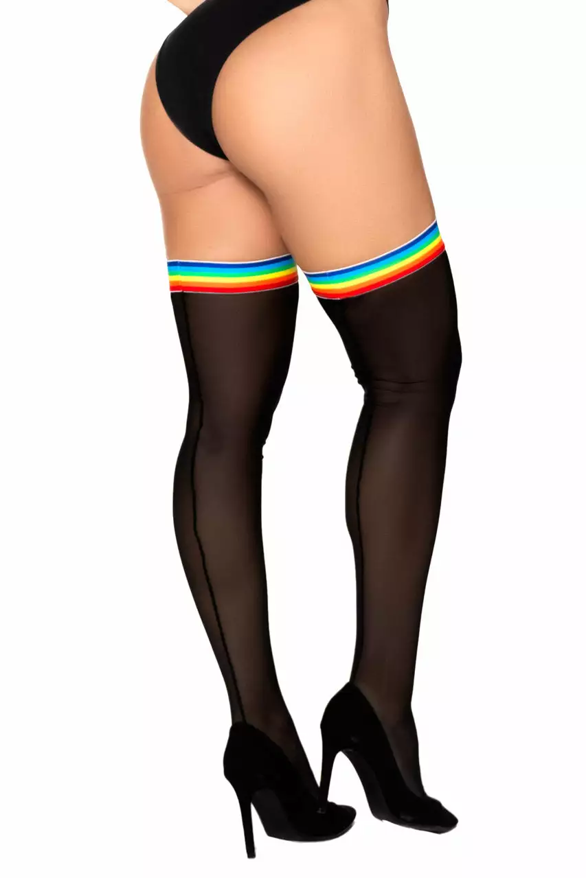 These black mesh thigh high stockings feature rainbow stripe tops.