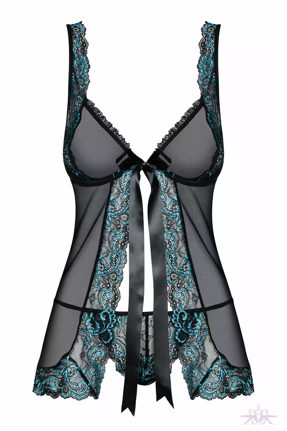 Seductive babydoll and thong set from Obsessive. Delicately adorned with black and blue lace and flattering front fastening. Featuring a lace edged thong.