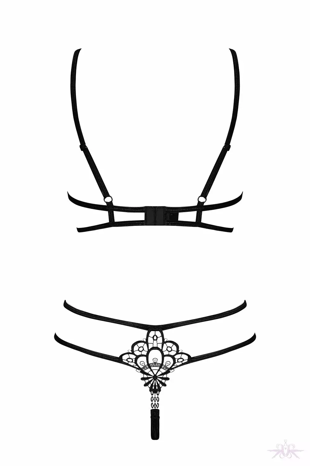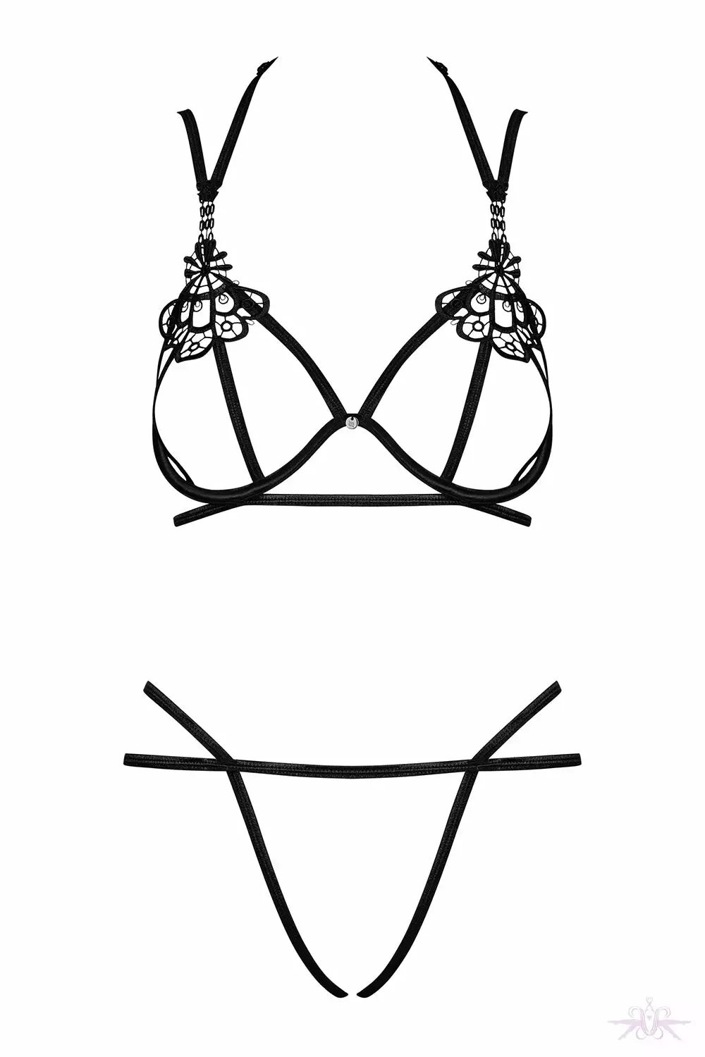 A seductive and extremely suggestive two piece set that will definitely excite and ignite your inner desires. Featuring a cupless semi open underwired bra that shapes and accentuates the breasts with multi strap details and lace accents. This set comprises of a cupless bra with adjusters to the shoulders and matching open thong.