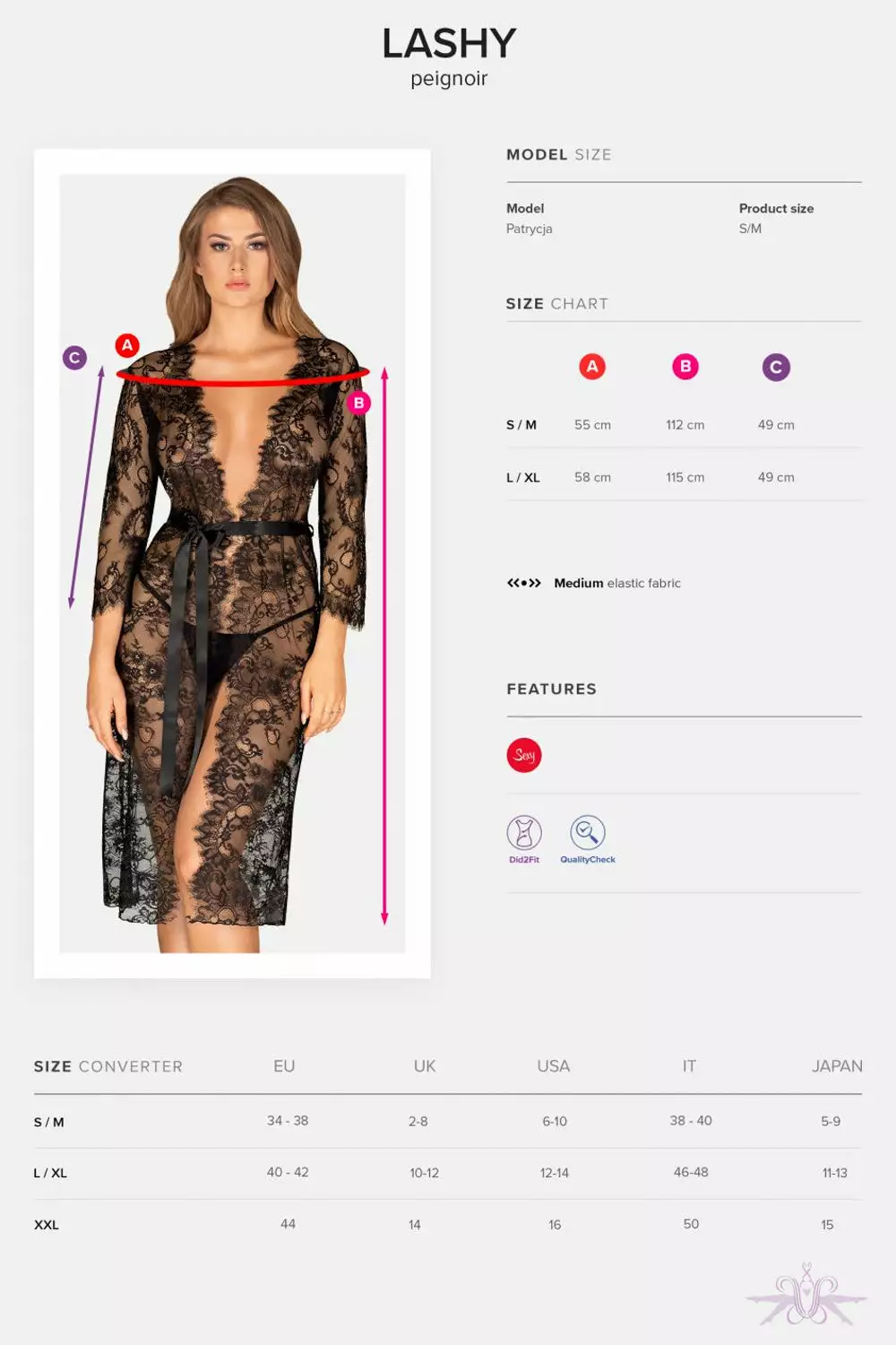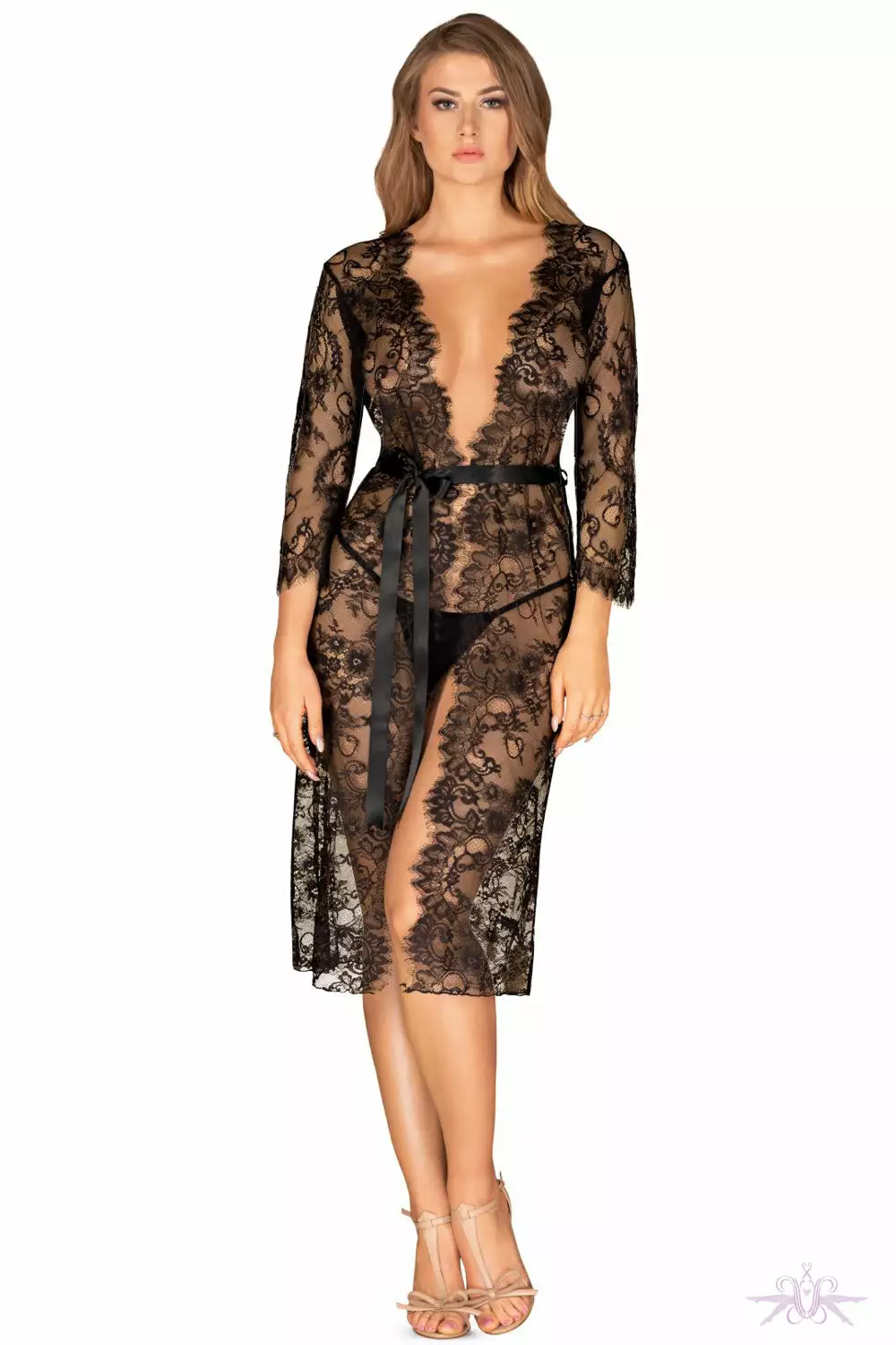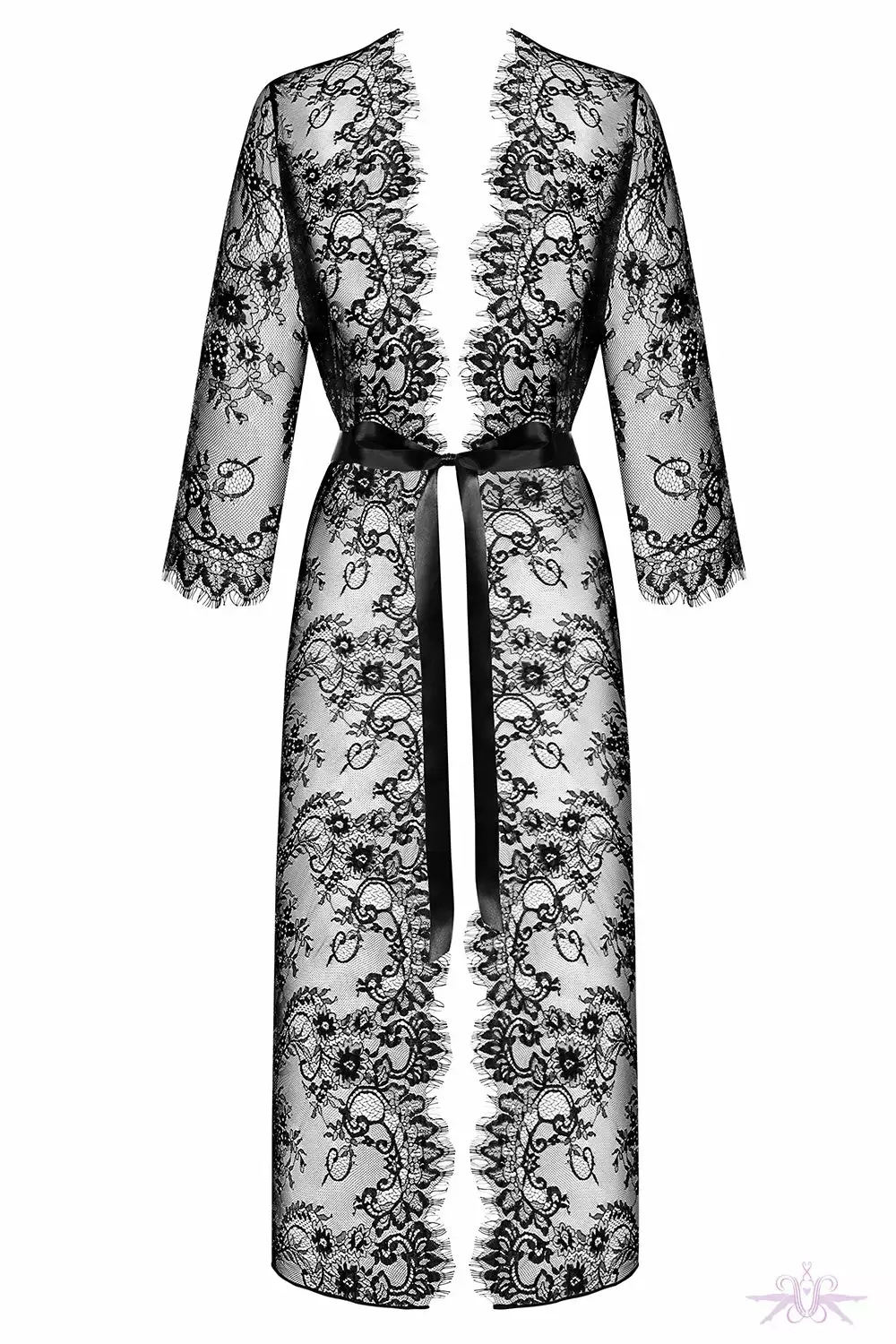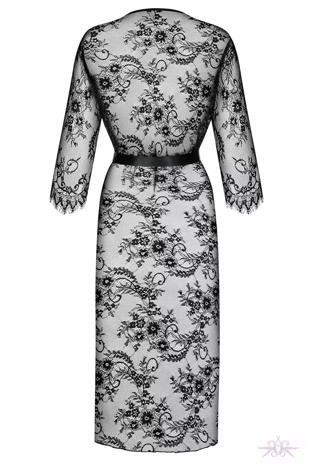 A stunning long lace black peignoir from Obsessive. The eyelash lace finish and unique floral pattern make it such a romantic piece. The sleeves are so seductive and the satin belt tied at the waist completes the look. A truly lovely robe for the romantic night in.