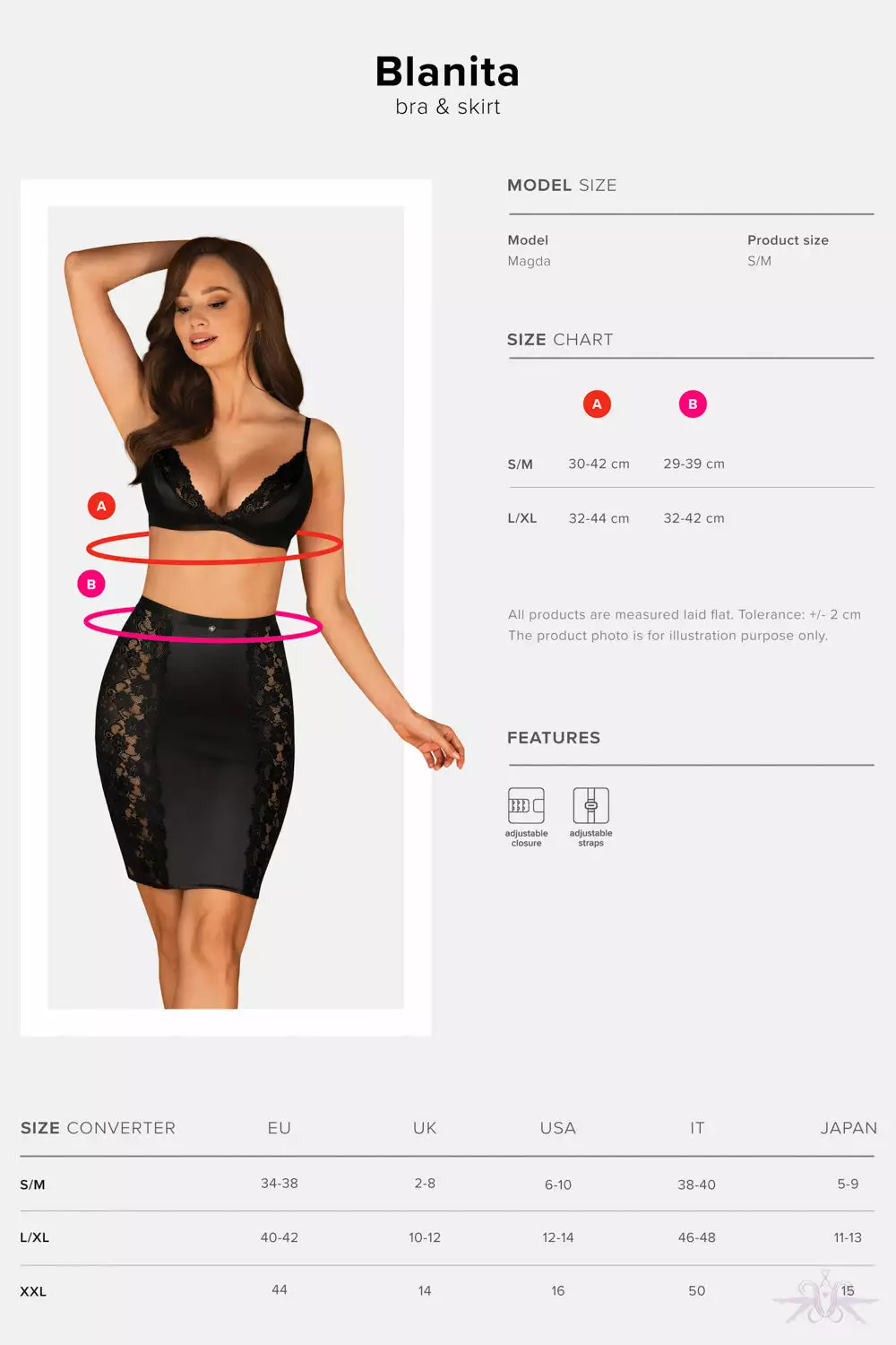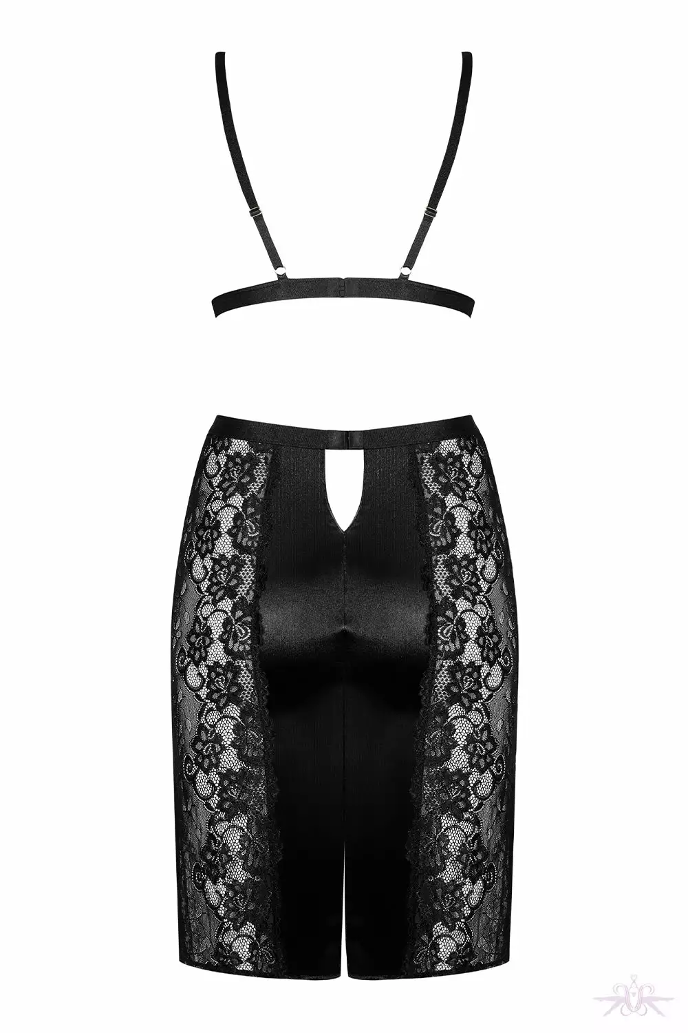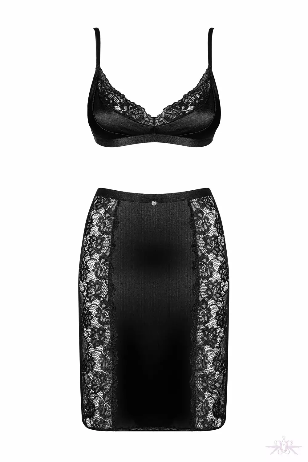 A gorgeously seductive satin black bra and embellished lace skirt from Obsessive. This elegant two piece set is so alluring and so glamorous. The bra has adjustable shoulder straps and multistage closure and delicate lace adorns the cups along with the side panels on the skirt. The skirt is a perfect fitting pencil skirt with a triangular cutout on the back.