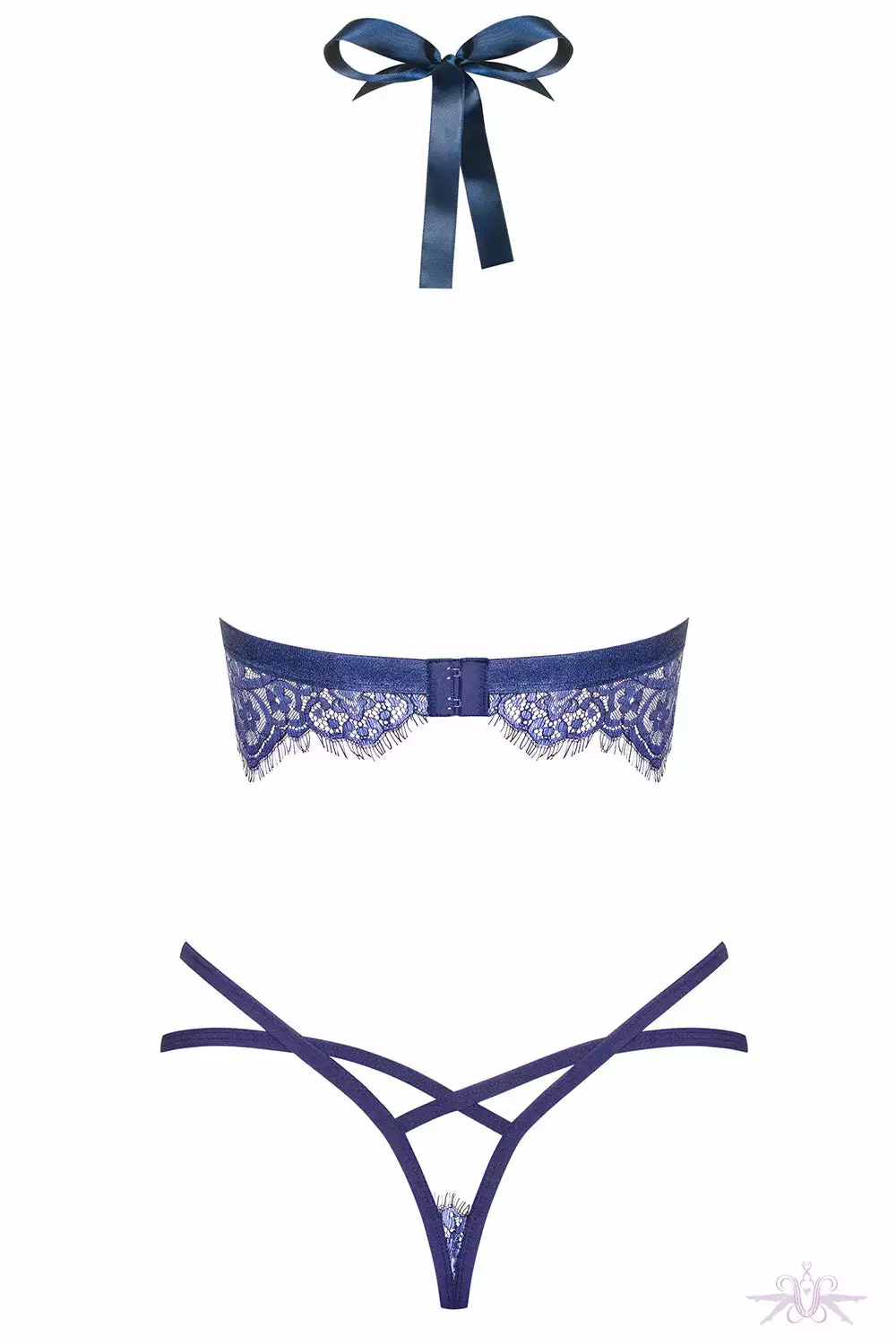 A sensual flow lace two piece set in a wonderful shade of blue. The bra is decorated with eyelash lace and has elegant lacing on the neck. The thong has bold cut outs and frivolous straps to enhance the curves. Match with the long lace robe.